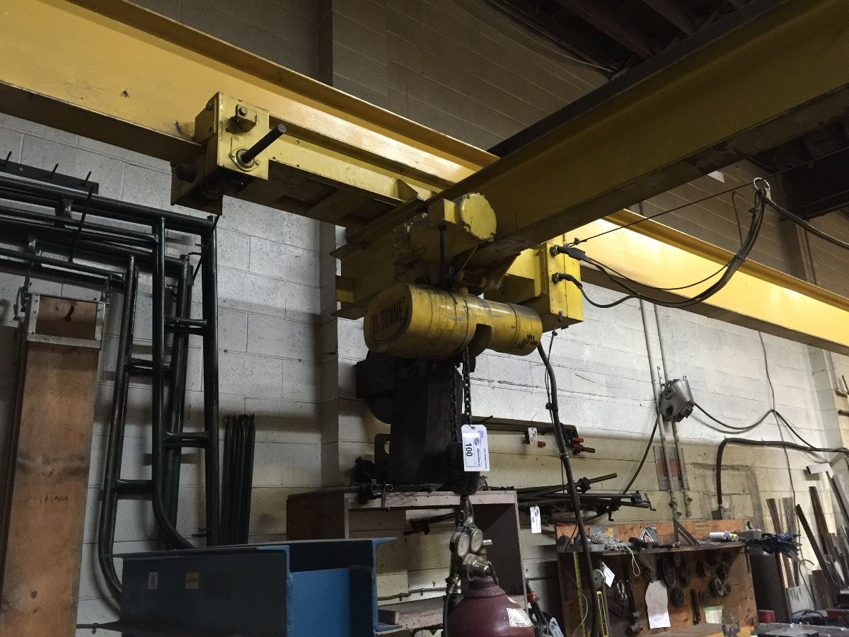 BUDGIT 1 1/2 TONNE SELF CONTAINED OVERHEAD ELECTRIC CRANE WITH ENGINEERS CERTIFICATION, RAILS AND POSTS