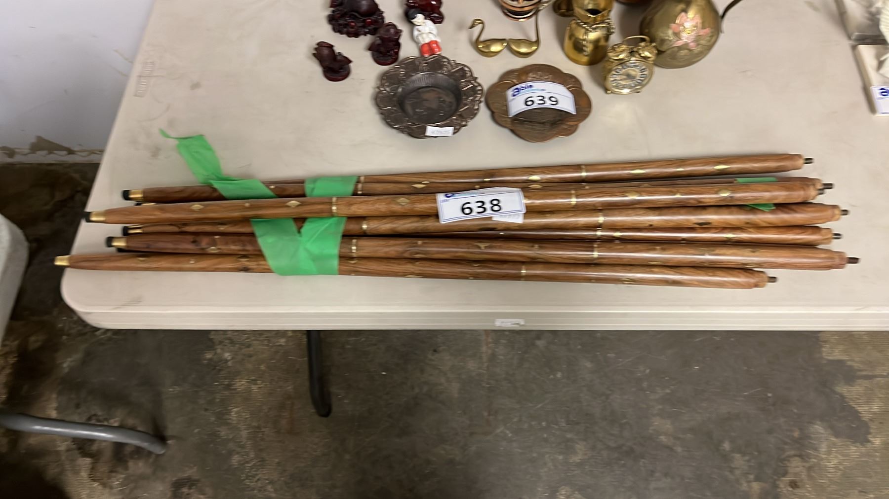 BUNDLE OF (10) HARDWOOD WALKING STICK SHAFTS WITH BRASS COLLAR FITTINGS & BRASS INLAY DESIGNS