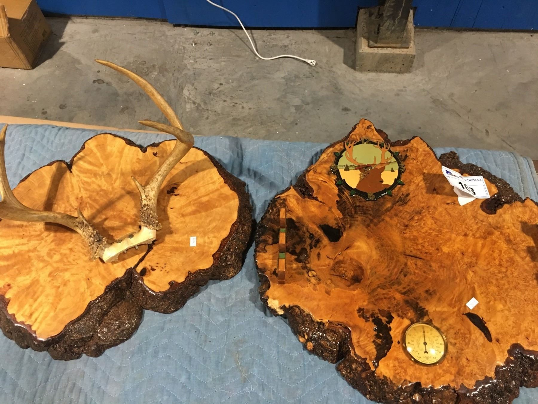 BURL CLOCK WITH BAROMETER AND BURL WITH MOUNTED HORNS (PIECES ARE APPROX 23" W ON CLOCK & APPROX 21" WIDE ON HORN FACE PIECE