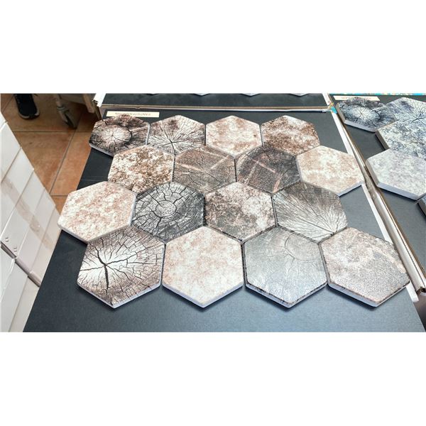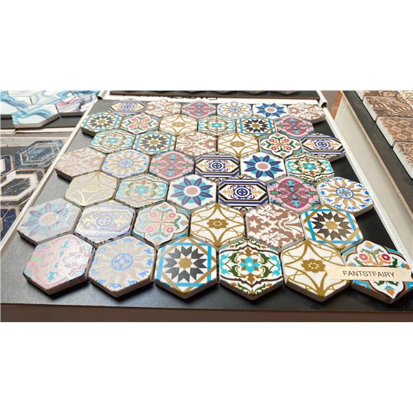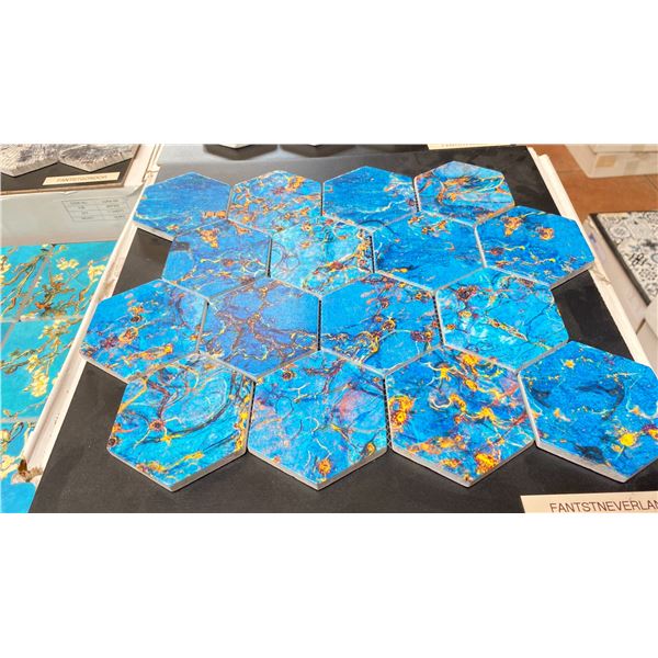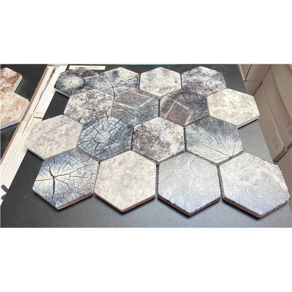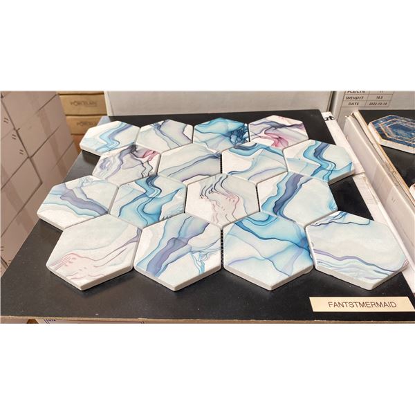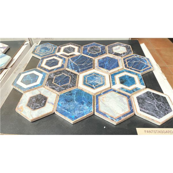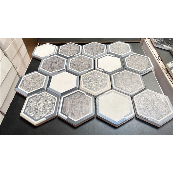8 BOXES OF MARBLE MOSAIC HEXAGON TILE IN FANTSTAIRY 11 X 1SQ.FT. SHEETS PER BOX APPROX 88SQ.FT.