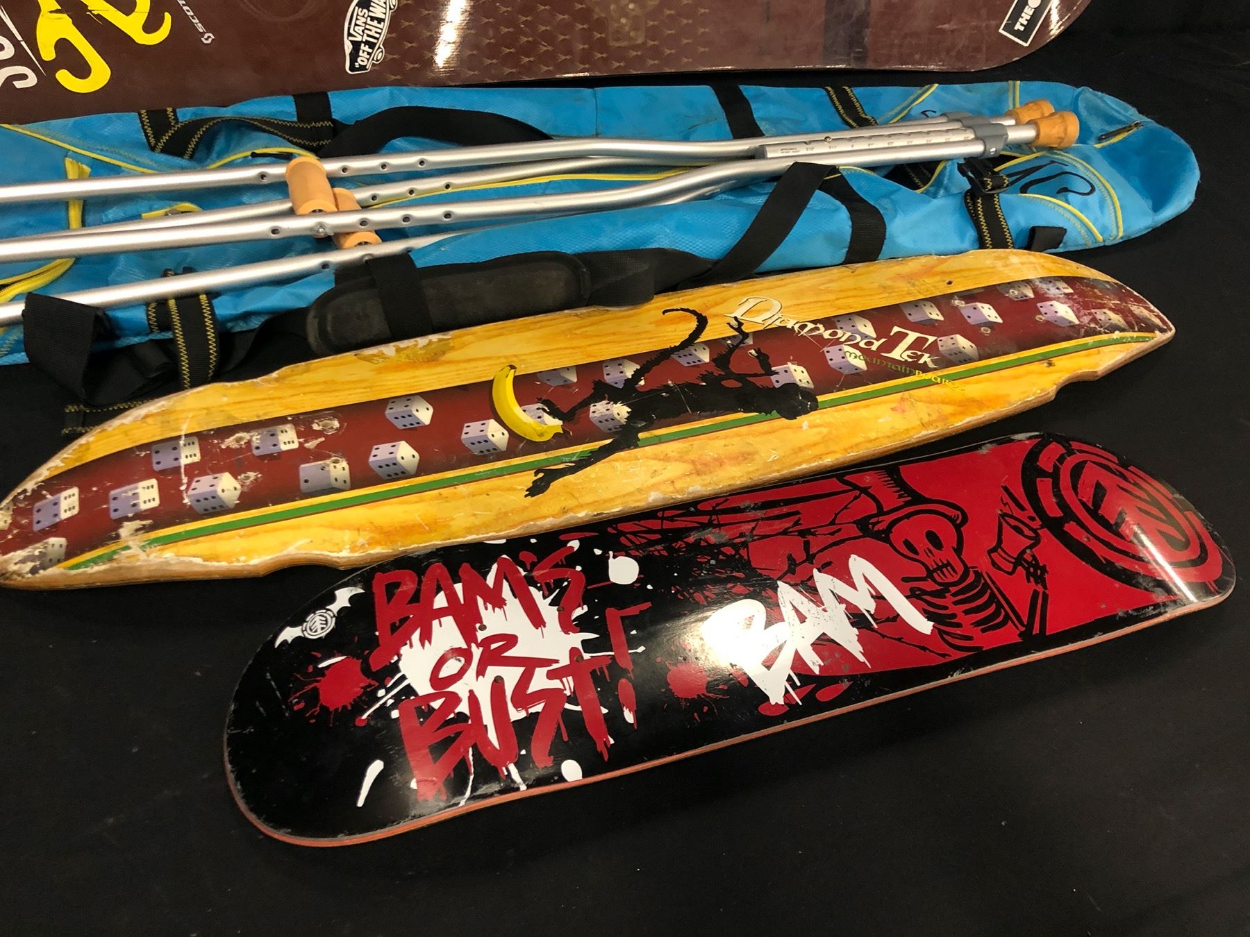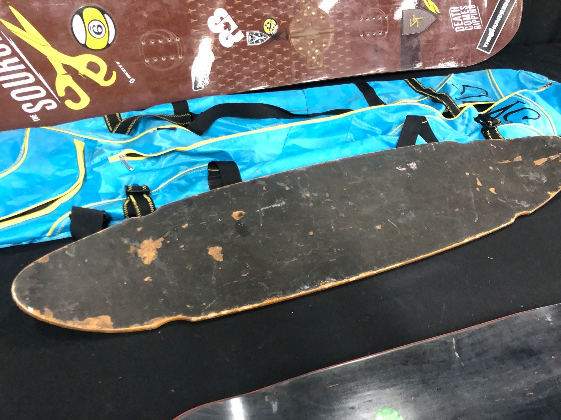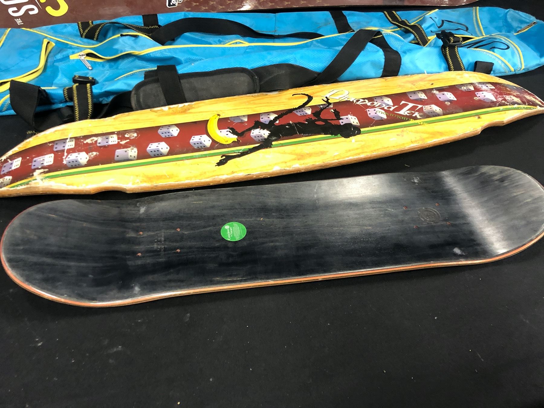 BURTON 162 CM SNOWBOARD, DIAMONDTEK LONGBOARD DECK, ELEMENT SKATEBOARD DECK (NO GRIP TAPE), AND SIMS 159 CM SNOWBOARD BAG
