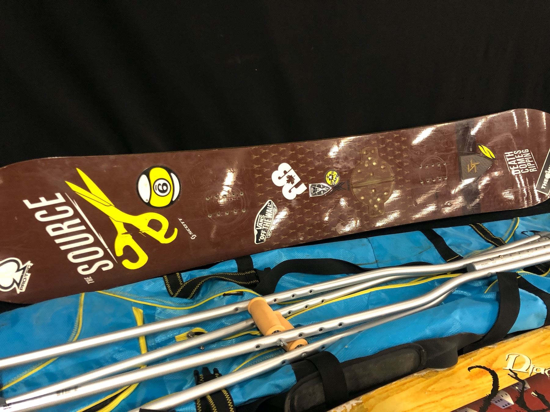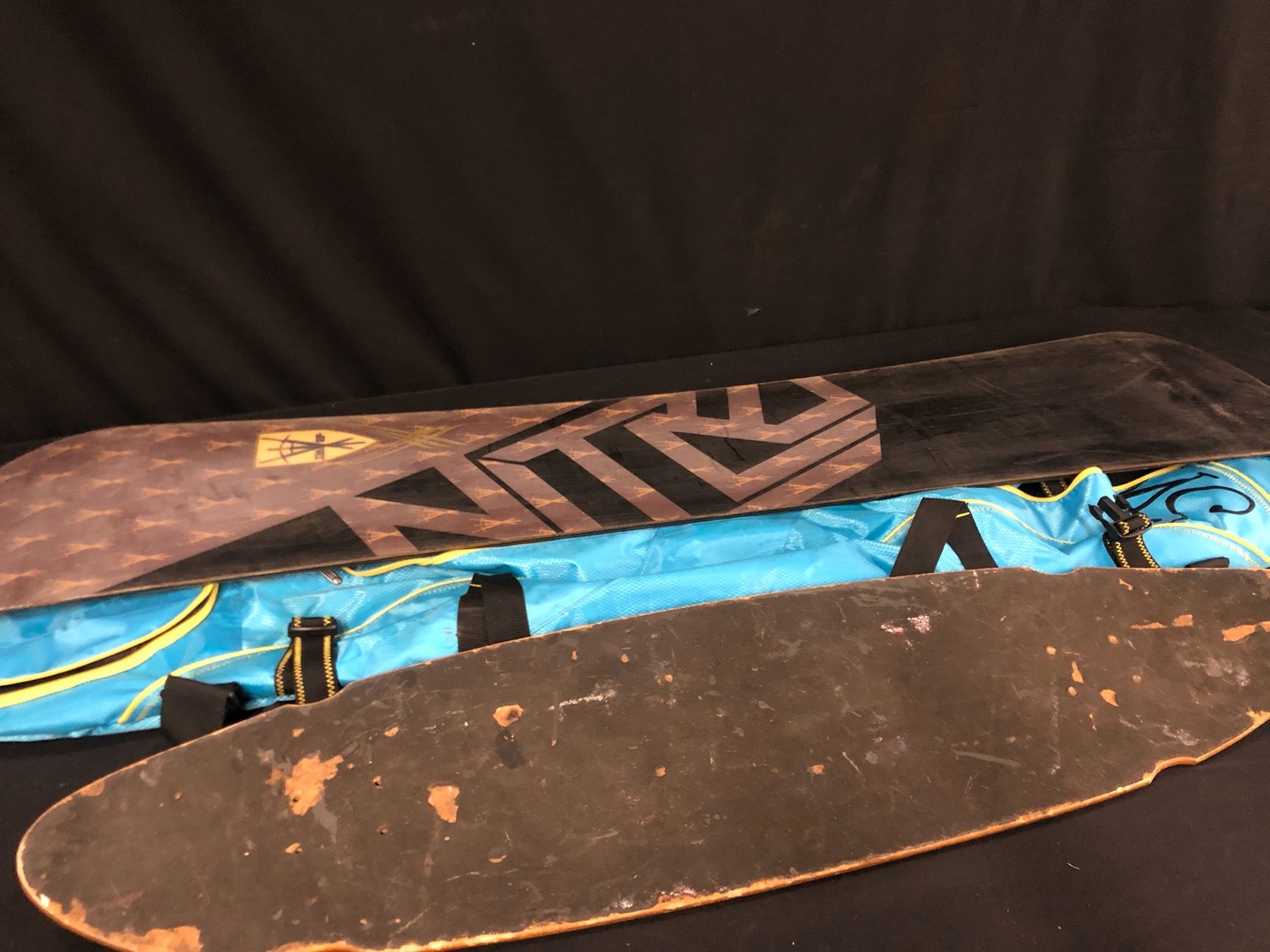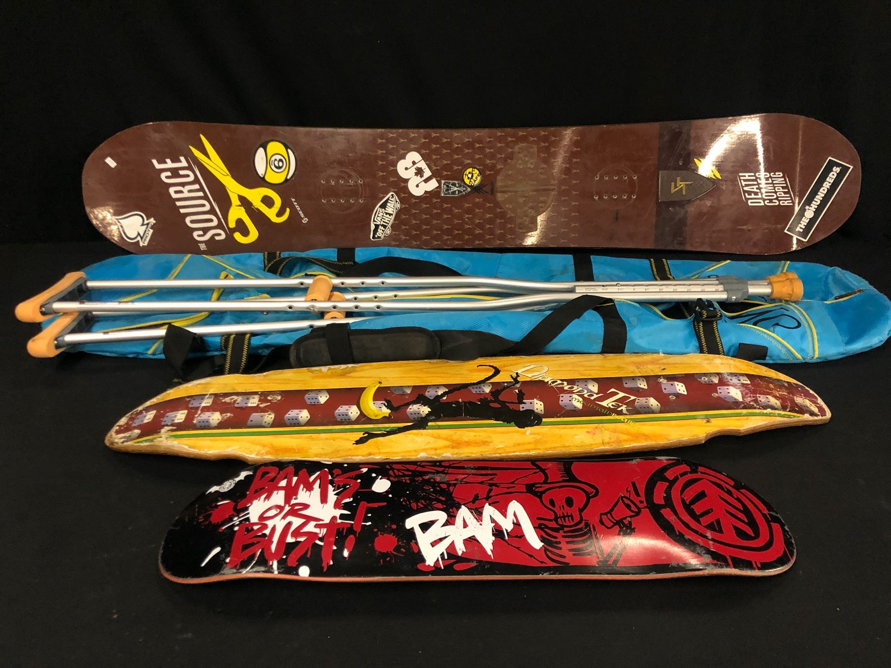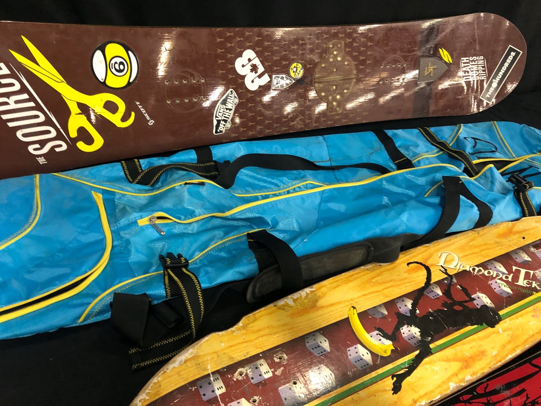 BURTON 162 CM SNOWBOARD, DIAMONDTEK LONGBOARD DECK, ELEMENT SKATEBOARD DECK (NO GRIP TAPE), AND SIMS 159 CM SNOWBOARD BAG