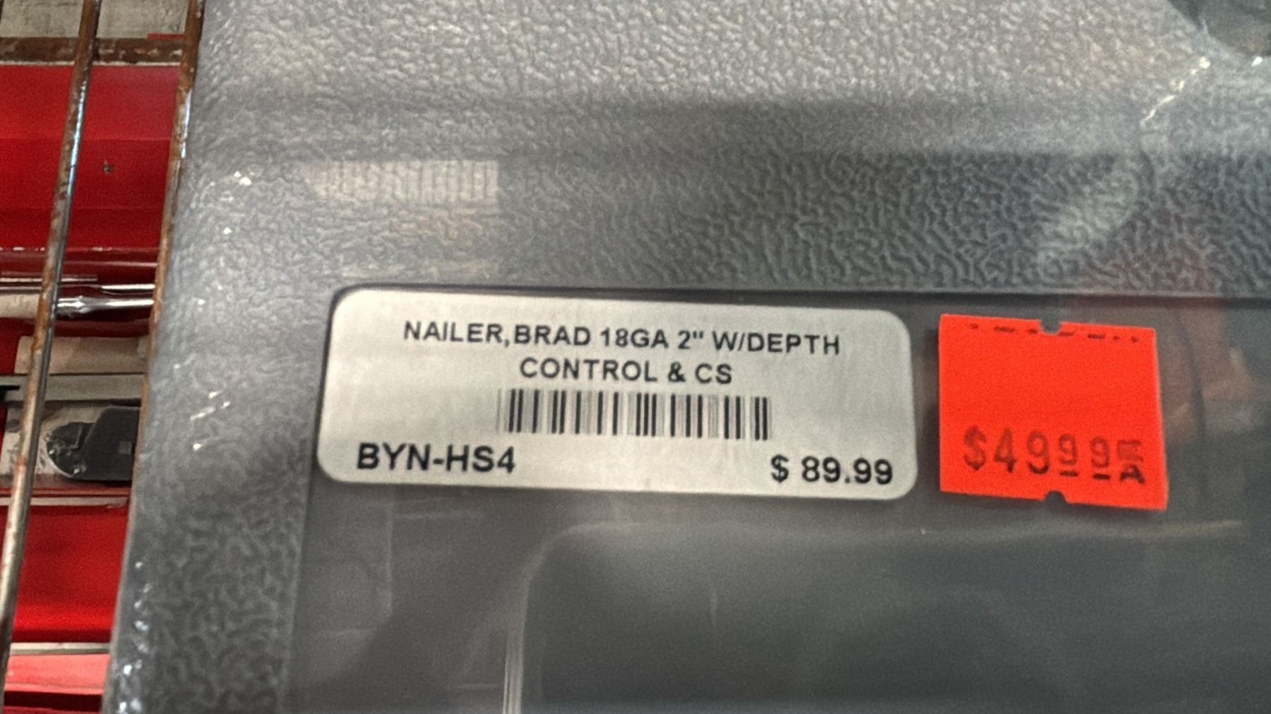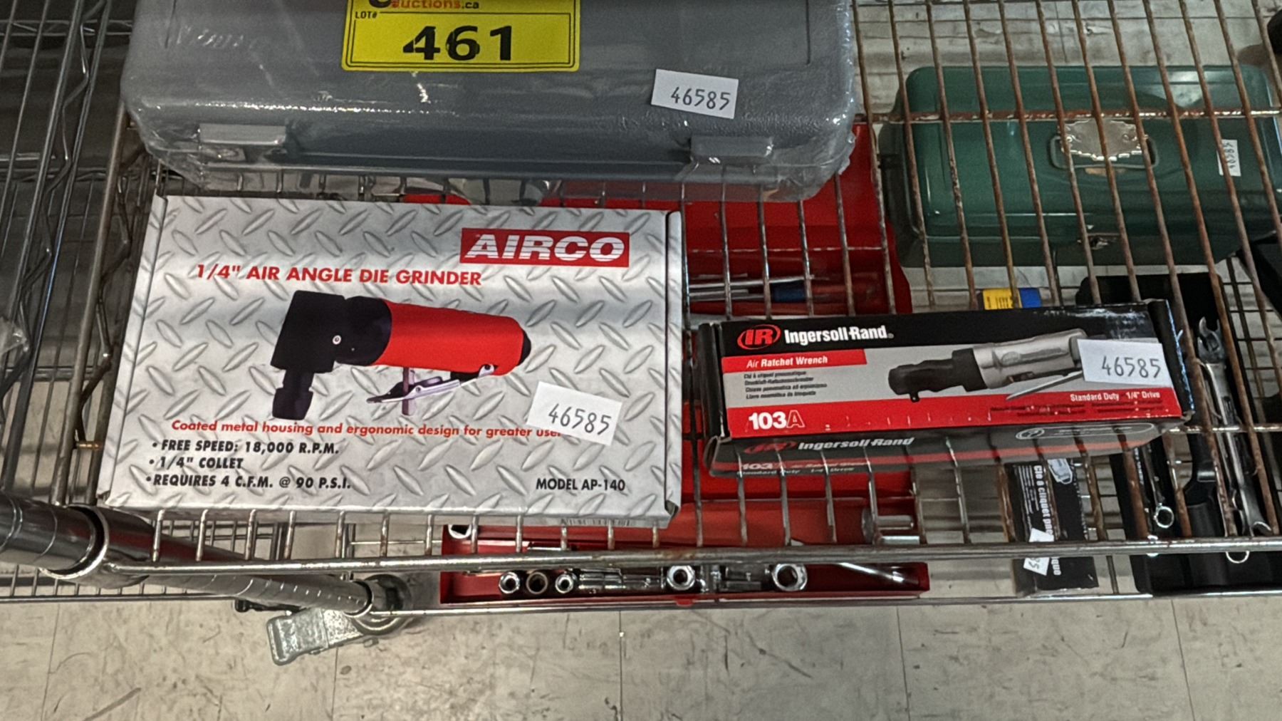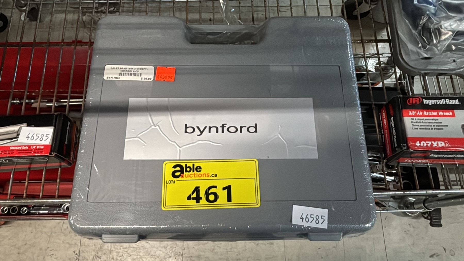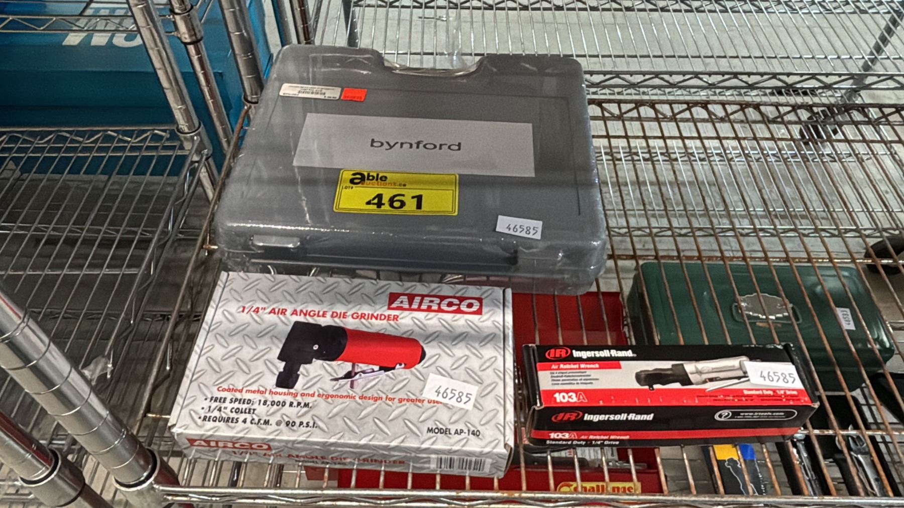 BYNFORD BRAD NAILER IN A HARD TRANSPORT CASE, AIRCO 1/4" AIR ANGLE DIE GRINDER & A INGERSOLL RAND AIR RATCHET WRENCH