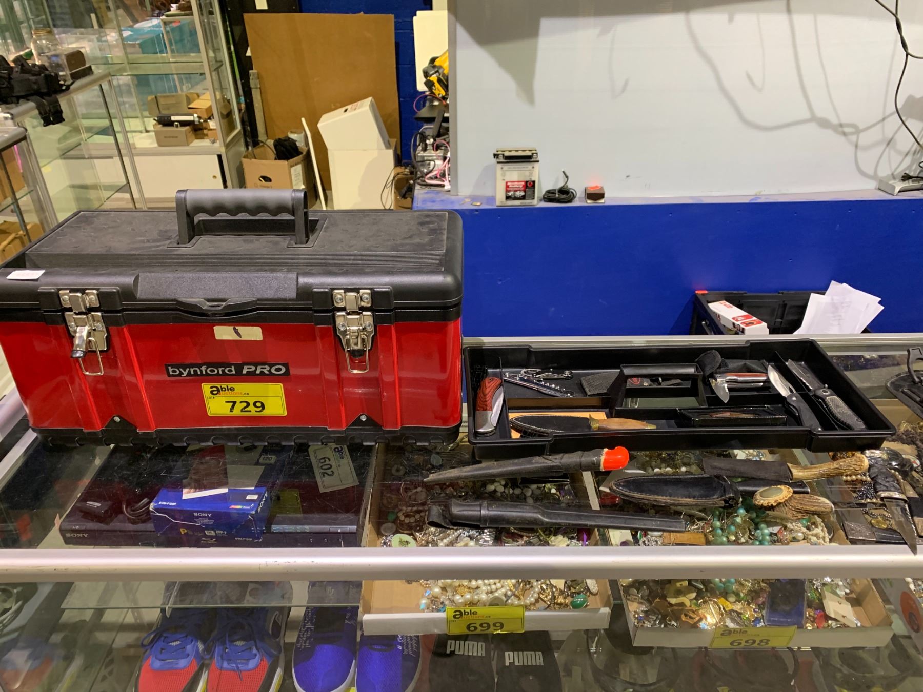 BYNFORD PRO TOOLBOX WITH ASSORTED KNIFE CONTENTS INCLUDING; NOWILL & SONS, SMITH & WESSON, BUCK &