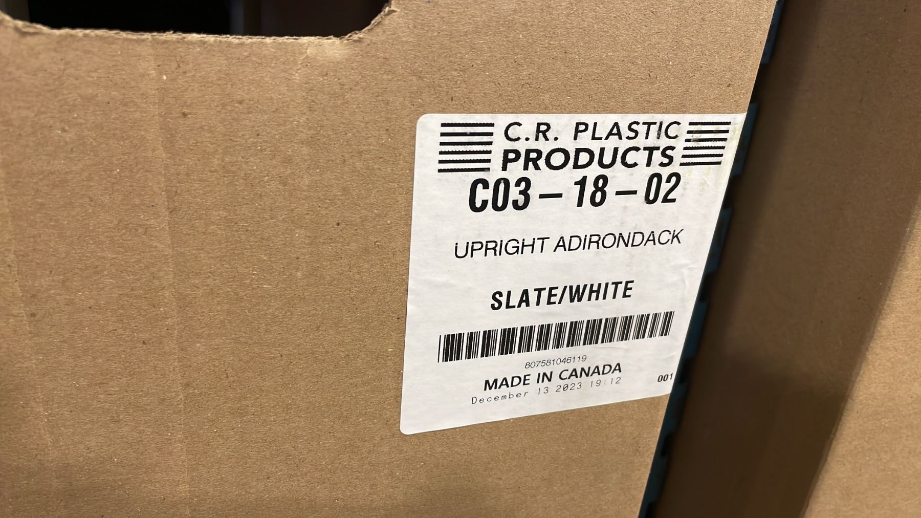 C.R. PLASTIC PRODUCTS MODEL C03-18-02. UPRIGHT ADIRONDACK OUTDOOR PATIO CHAIR COLOR SLATE / WHITE *IN BOX*