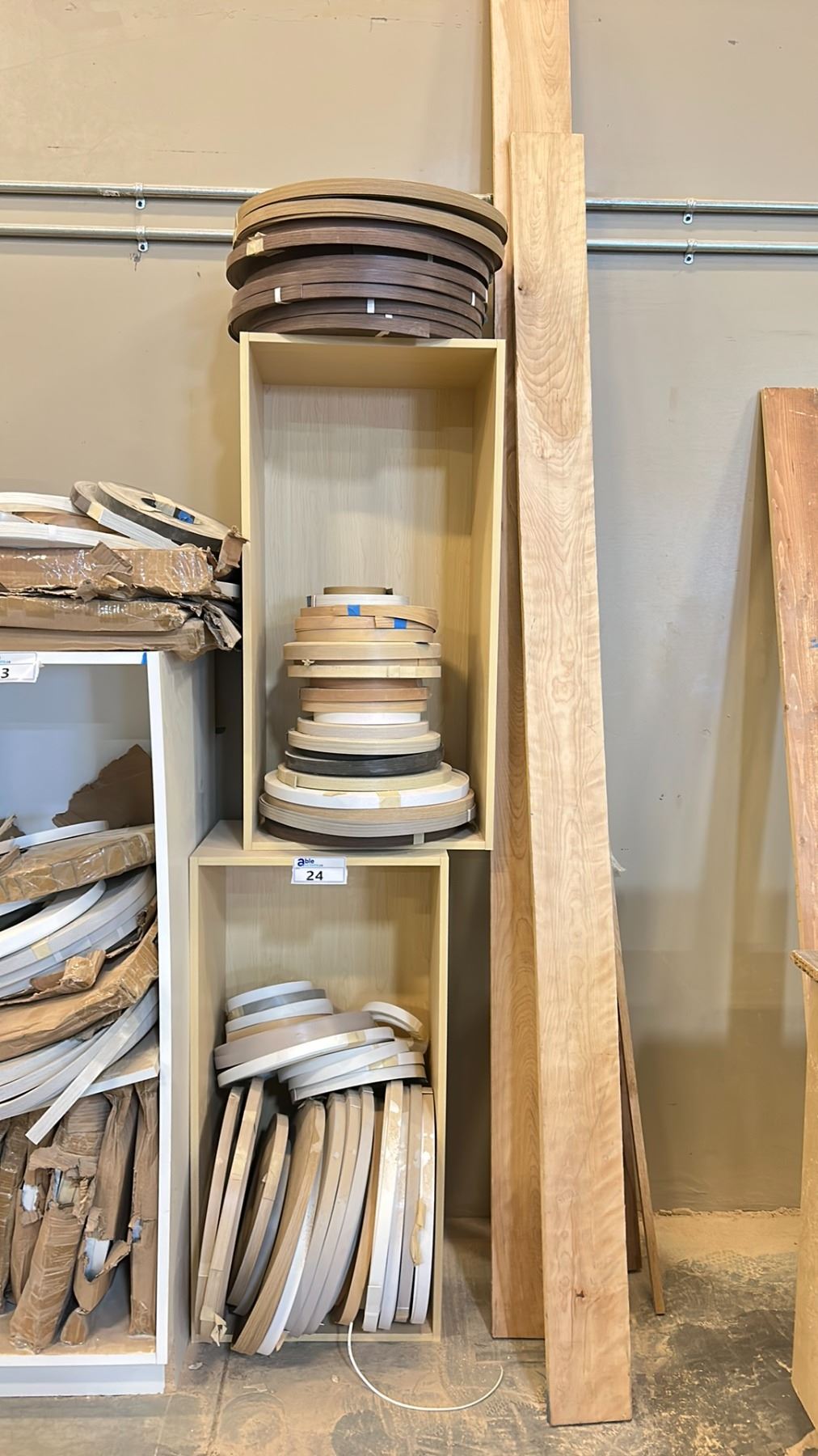 CABINET WITH CONTENTS, ASSORTED EDGEBANDING, APPROXIMATELY 57 ROLLS INCLUDING APPROXIMATELY 16 FULL ROLLS AND 41 PARTIAL ROLLS.