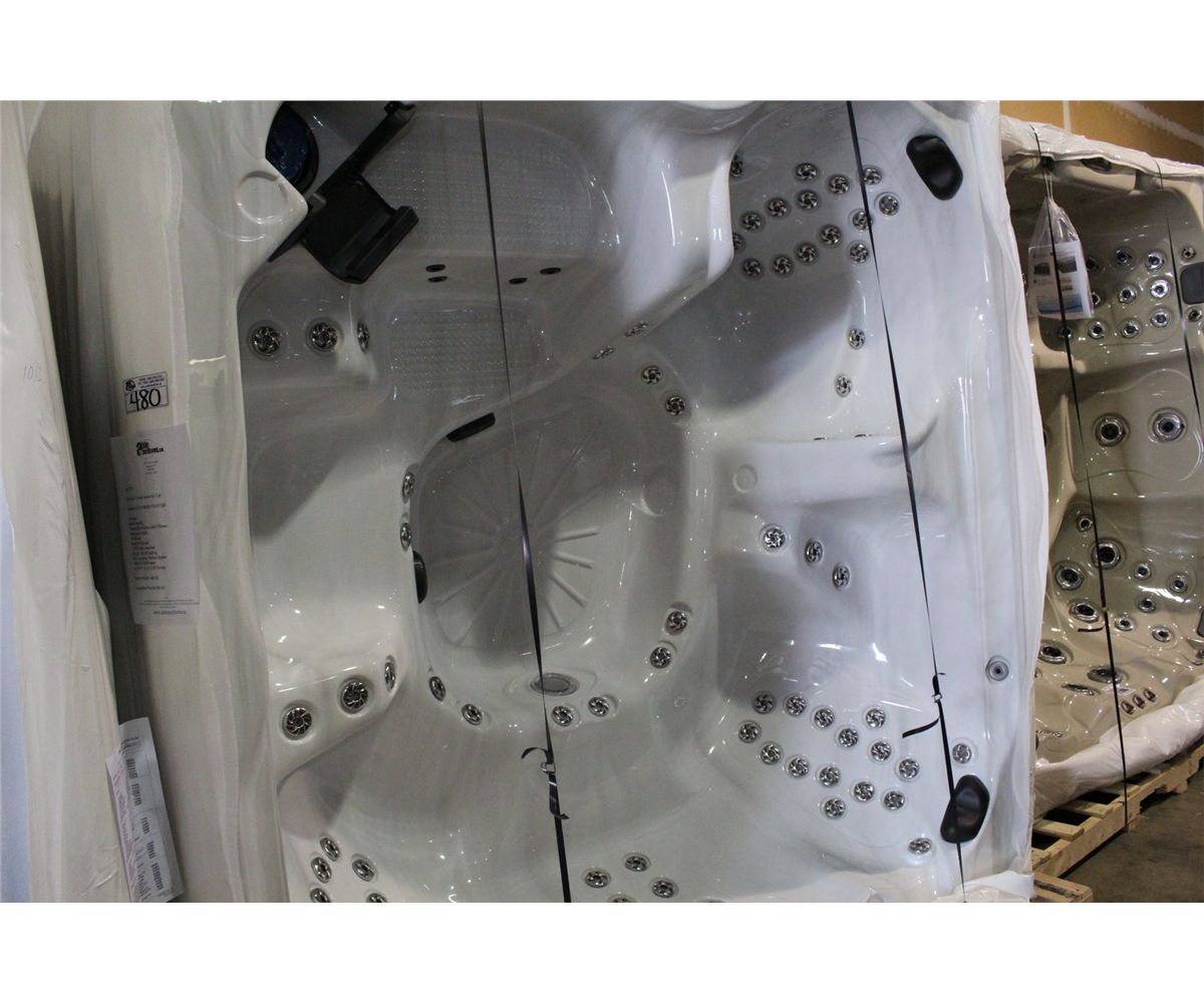 CAL SPA 8' FAMILY SERIES HOT TUB MODEL L-S11-FA890B-11S-001586 6 PERSON, BENCH SEATING, STERLING SILVER INTERIOR W/3 PILLOWS, MAHOGANY CABINET, 90 SS JETS, OZONATOR, 24HR FILTRATION, 2X5HP & 1X1.5HP PUMPS RETAIL $11,460.00