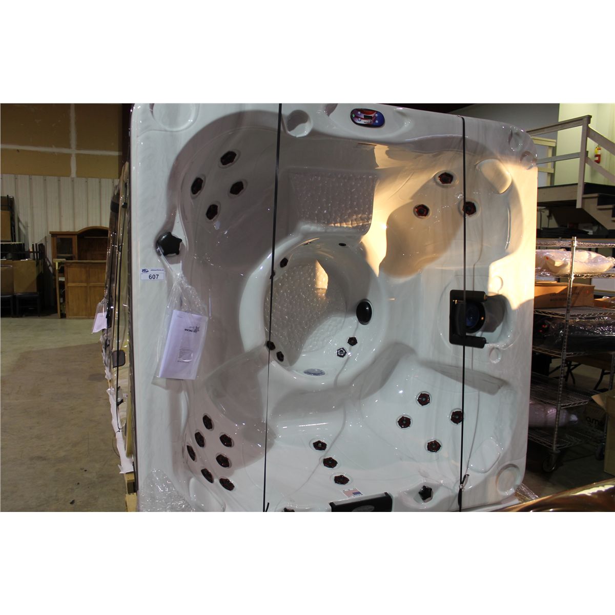 CAL SPAS AMERICAN BENCH SEAT HOT TUB, 7.5'X7.5' PREFERRED SMOKE CABINET WITH STERLING SILVER INTERIOR C/W 30 SS RED STAR FIRE JETS, 50 SQ FT SURFACE FILTER WITH WIER GATE, LED CASCADE WATERFALL, 5.5 KW HEATER, 5 BHP 2 SPEED PUMP, PURE SILK OZONATOR, LED S