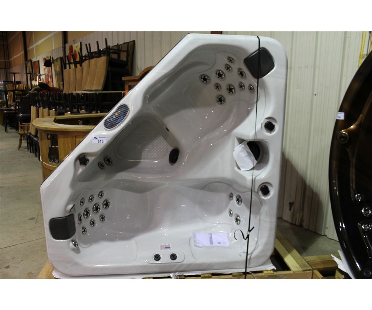 CAL SPAS AMERICAN SERIES HOT TUB, 72X72X35 PREFERRED MAHOGANY CABINET WITH SUNSET STORM INTERIOR C/W 28 SS RED STAR FIRE JETS, 50 SQ FT SURFACE FILTER WITH WEIR GATE, 5.5 KW HEATER, 2 BHP 2 SPEED PUMP, LED SPA LIGHT, PURE-SILK OZONATOR, LED LIT FOUNTAINS