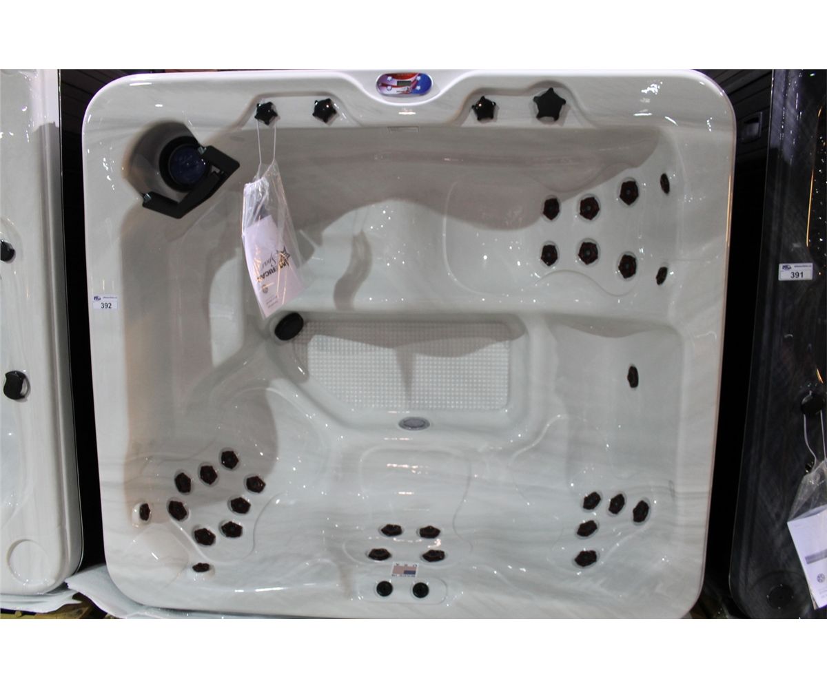 CAL SPAS AMERICAN SERIES HOT TUB, 84X74X36 PREFERRED SMOKE CABINET WITH STERLING SILVER INTERIOR C/W 30 SS RED STAR FIRE JETS, 50 SQ FT SURFACE FILTER WITH WIER GATE, 5.5 KW HEATER, 5 BHP 2 SPEED PUMP, PURE-SILK OZONATOR, LED LIT FOUNTAINS, EASY ACCESS CA