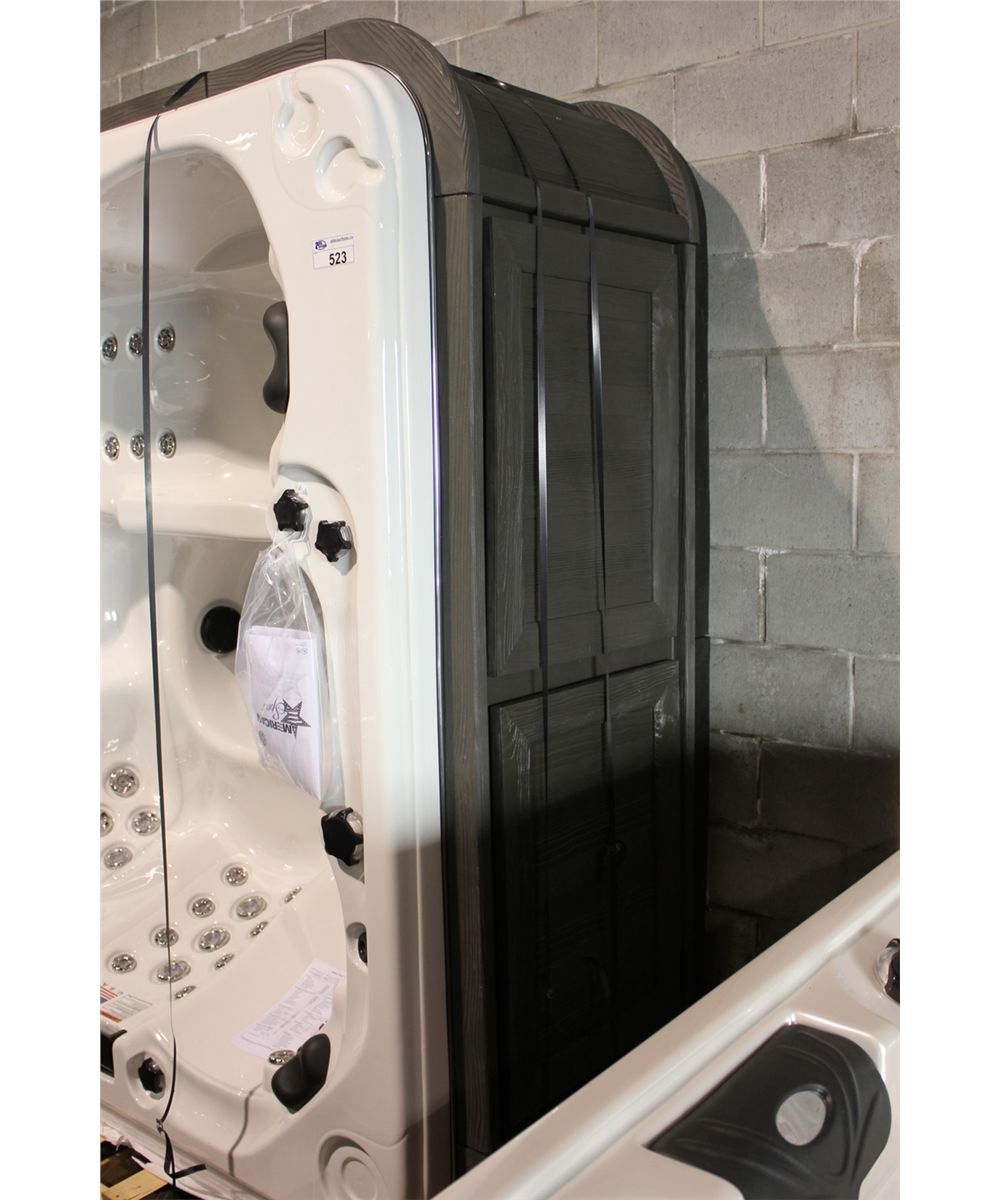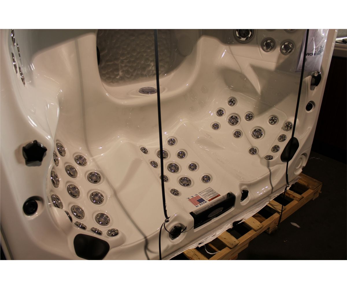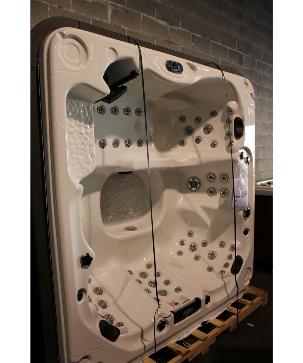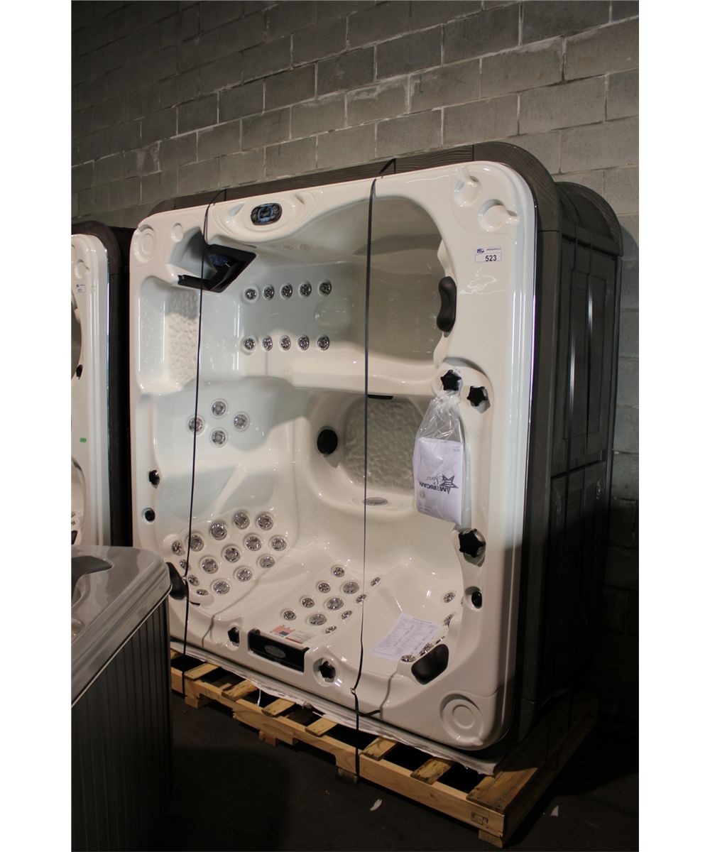 CAL SPAS AMERICAN SERIES HOT TUB WITH WHITE INTERIOR AND 8' CUSTOM WALNUT CABINET. C/W: 70 SS STAR FIRE JETS, WATERFALL CASCADE WHISPER QUIET HEATER, 2 X 5.0 HP PUMPS, LED DUAL HYDRO STREAMERS, LOUNGER, CUSTOM PEBBLE FLOORING, EXCLUSIVE HI-LIGHT JET LED LIGHTING SHORT HERCULES CABINET, 50 SQ FT FILTER WITH WIER GATE, S/N 001954