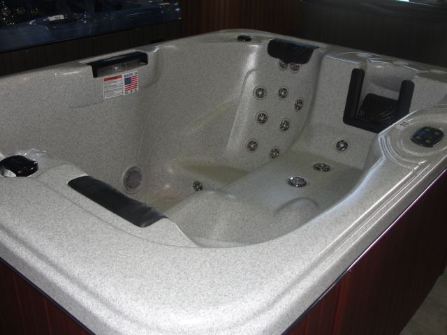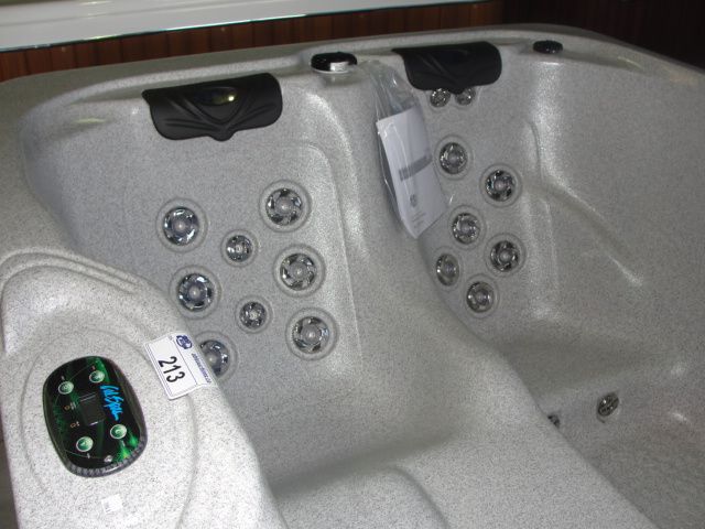 CAL SPAS AQUA SELECT SERIES HOT TUB WITH SAHARA INTERIOR AND 84"X64" MAHOGANY CABINET. FEATURES INC: 36 SS CANDY CANE JETS, WATERFALL CASCADE, 50 SQ FT FILTER WITH WIER GATE, DOUBLE LOUNGER, 5.5 KW HEATER, 5 BHP PUMP, LED SPA LIGHT, PURE SILK OZONATOR.  S/N 001932