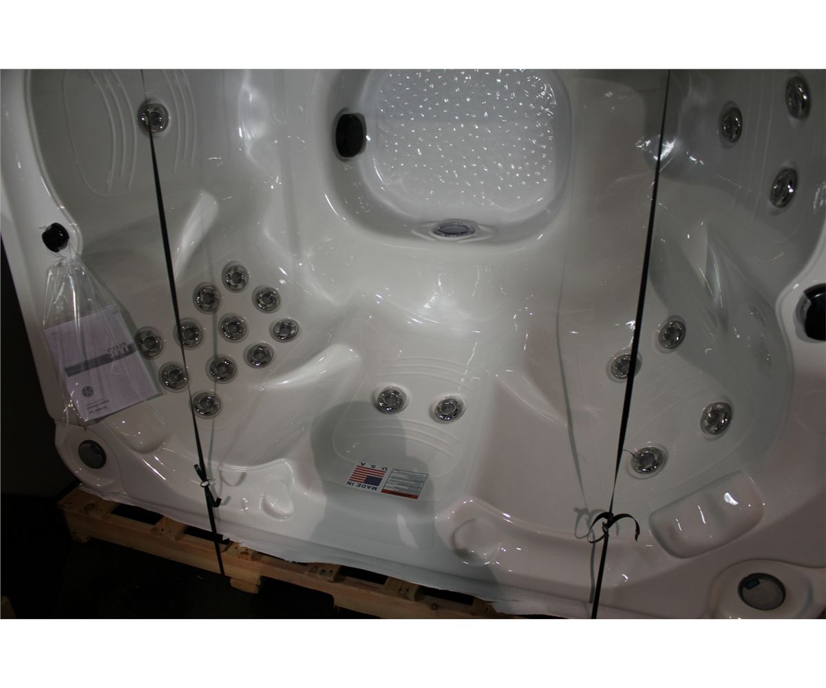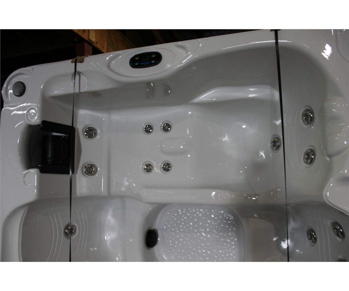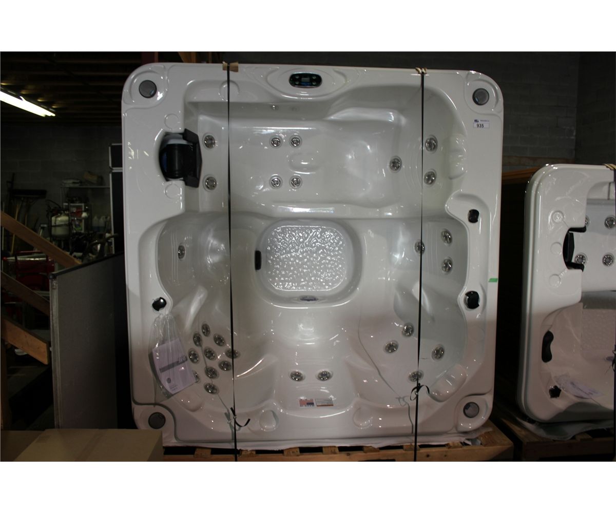 CAL SPAS AQUA SERIES HOT TUB WITH IVORY INTERIOR AND 7.5' WALNUT CABINET. C/W: 30 SS CANDY CANE JETS, LED SPA LIGHT, ISOUND IPOD STATION WITH 4 AQUATIC AV SPEAKERS, 5.5 KW HEATHER, 2 BHP PUMP, CUSTOM PEBBLE FLOORING AND MORE... S/N 001928