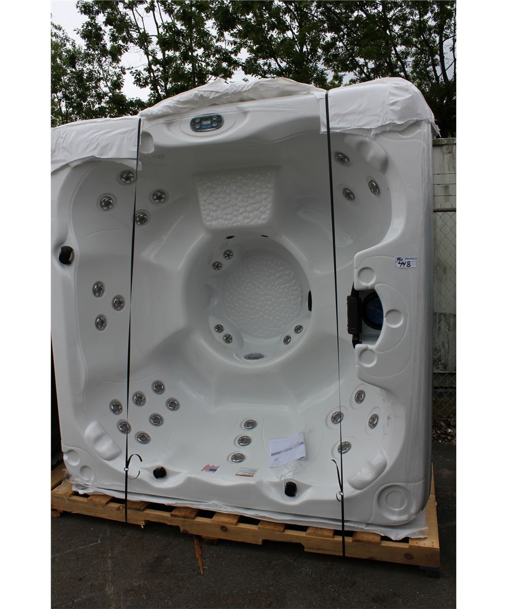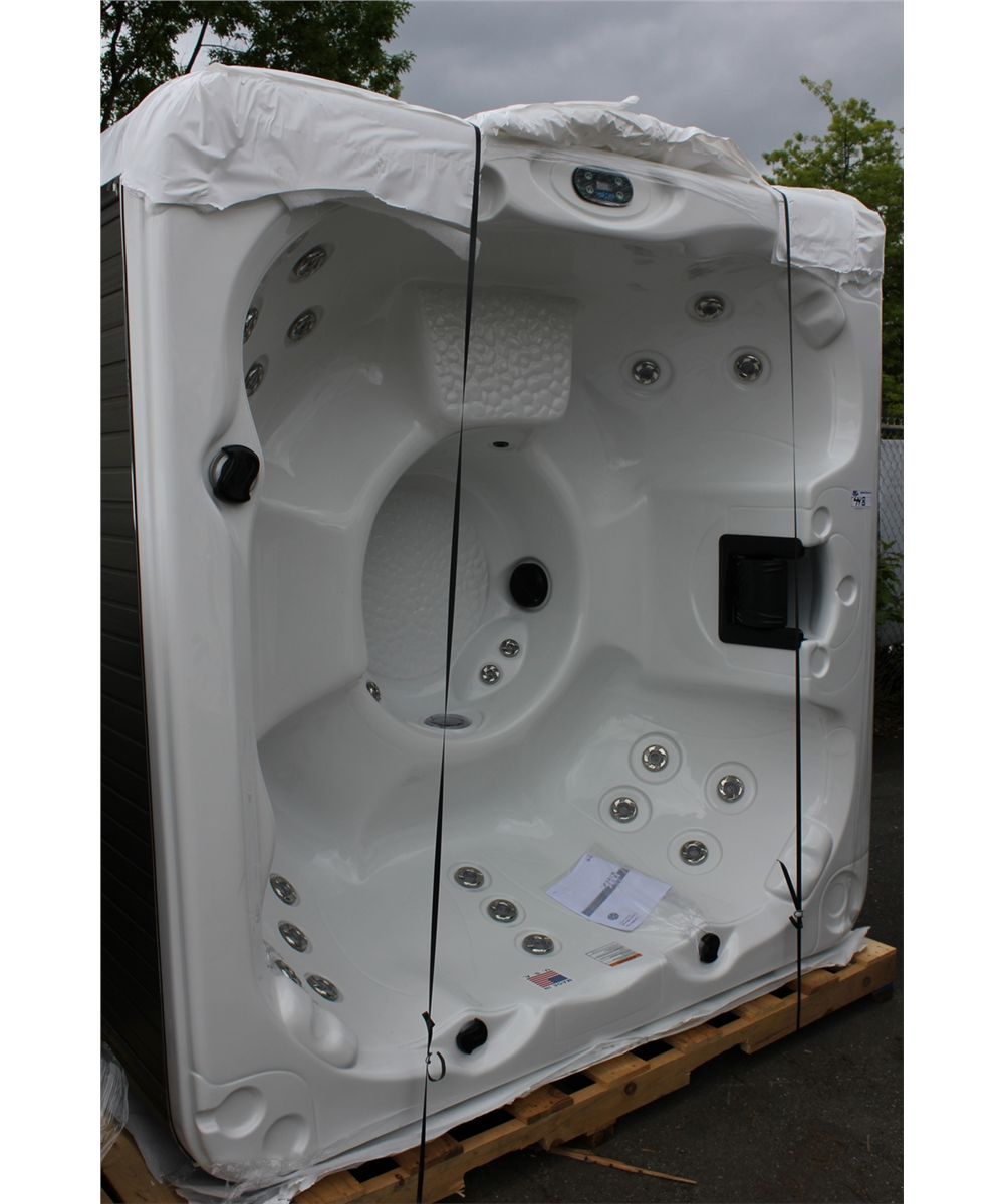 CAL SPAS AQUA SERIES HOT TUB WITH SNOW WHIT INTERIOR AND PREFERRED MIST 7.5' CABINET C/W 30 SS CANDY CANE JETS, 5.5 KW HEATER, 2 BHP PUMP WITH 110 VOLT CONVERSION KIT, PURE SILK OZONATOR, LED BLUE SPA LIGHT, 50 SQ FT FILTER WITH WIER GATE AND MORE. SER. 000109