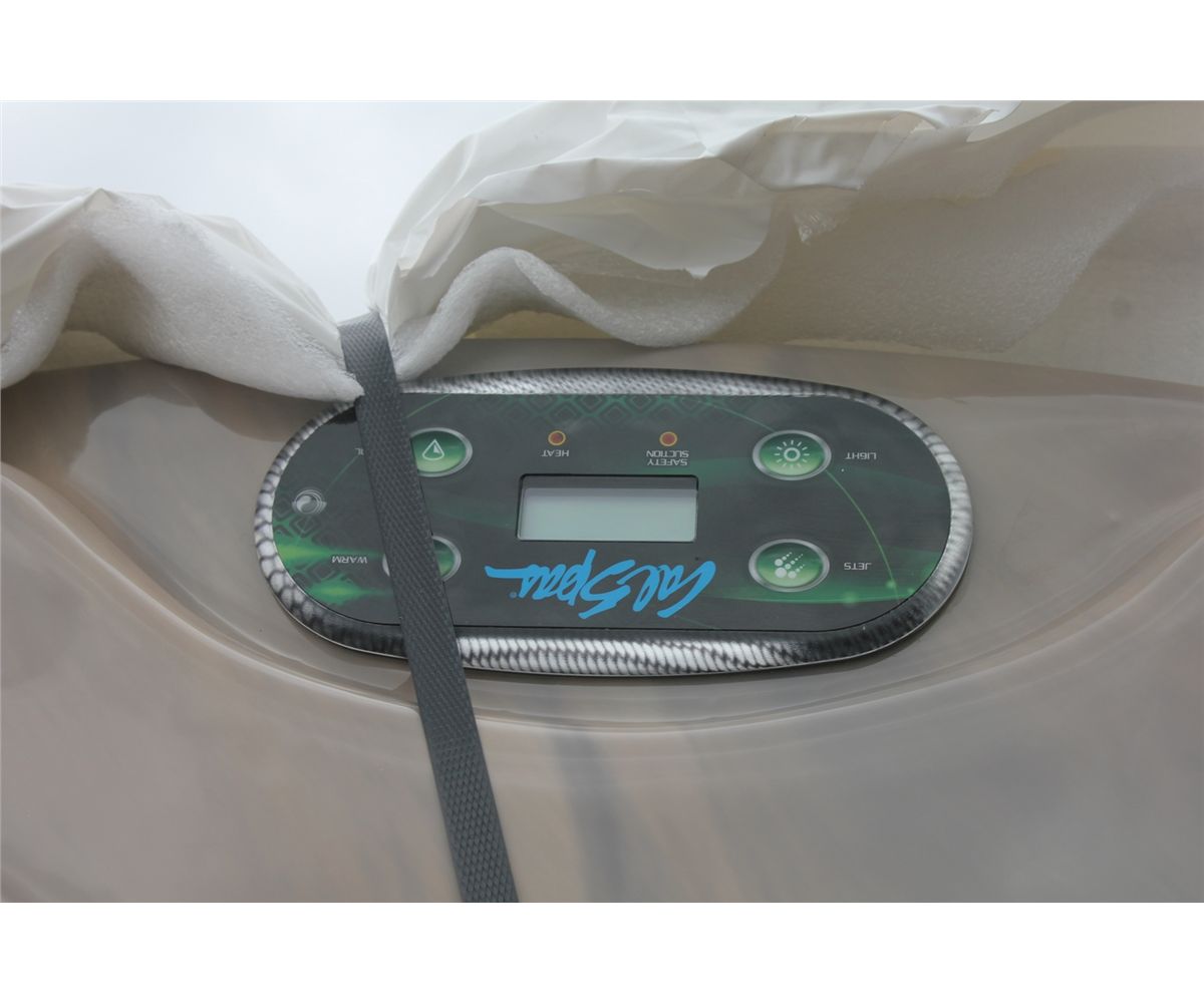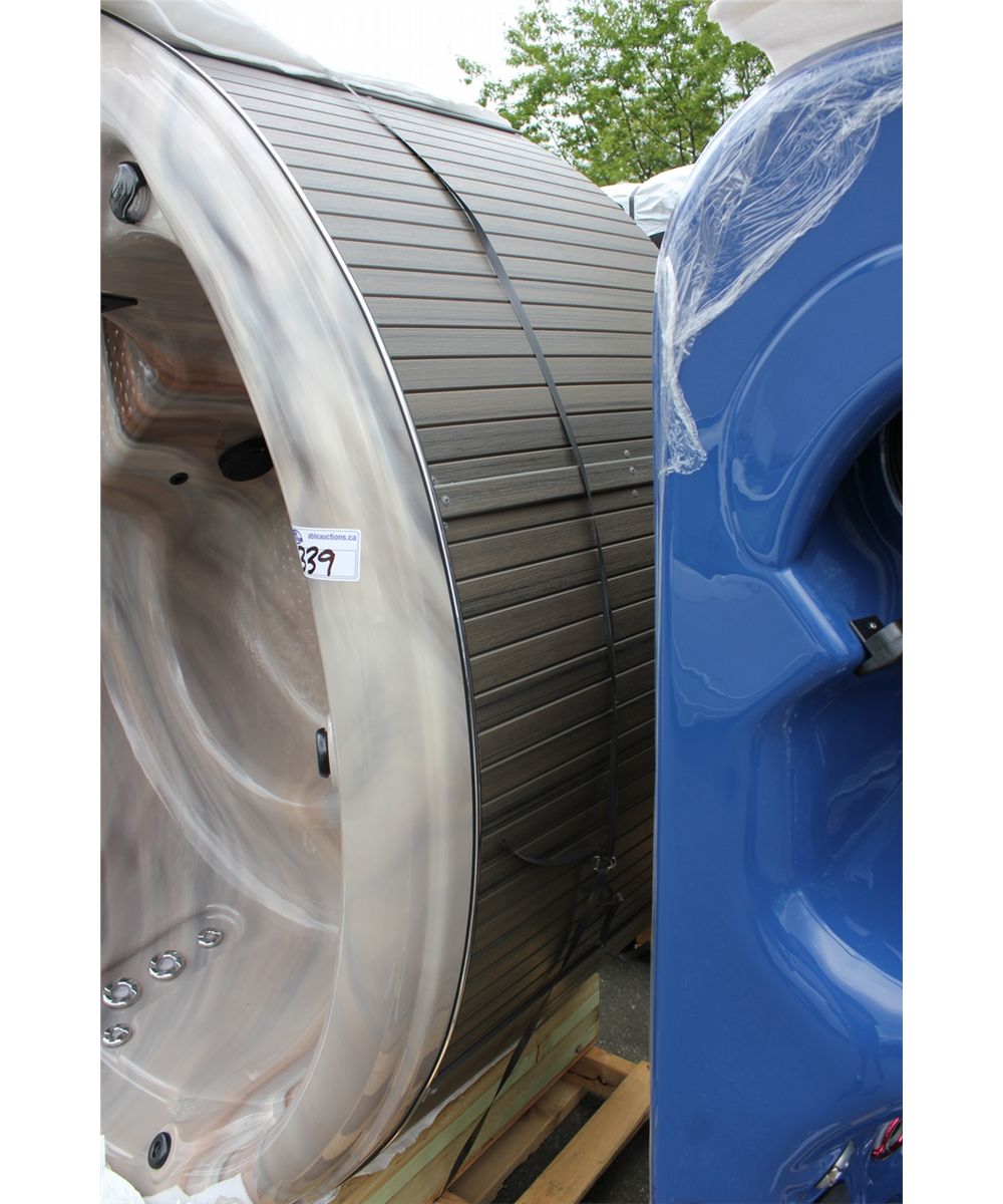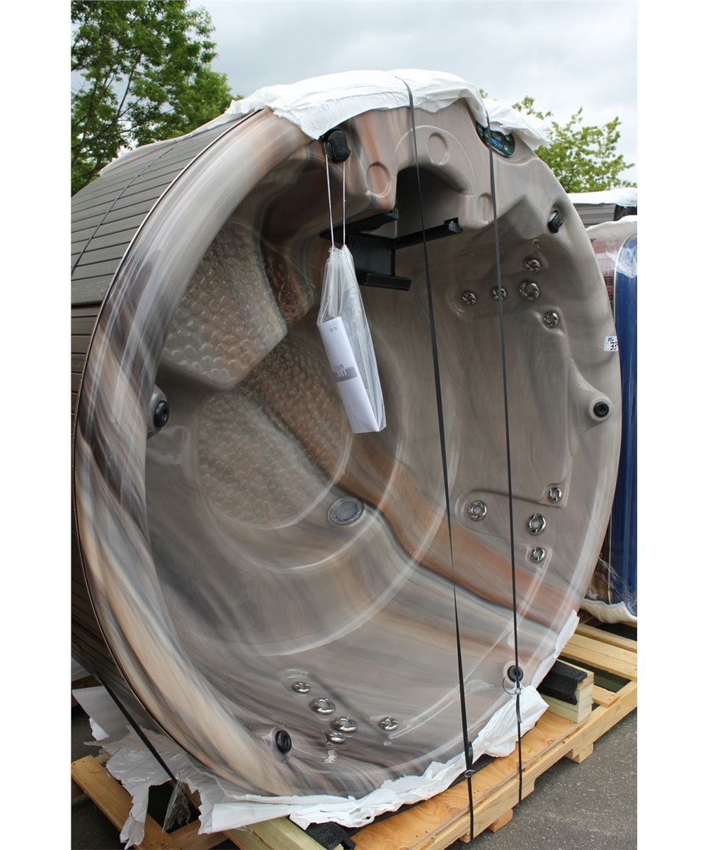 CAL SPAS AQUA SERIES ROUND HOT TUB WITH SUNSET STORM INTERIOR AND PREFERRED SMOKE 78" CABINET C/W: 18 SS CANDY CANE JETS, 5.5 KW HEATER, 2.0 BHP PUMP WITH 110 VOLT CONVERSION KIT, EXCLUSIVE HI LIGHT JET LED LIGHTING, LED SPA LIGHT, 4 MULTI COLOR LED HYDRO STREAMER WATERFALLS 50 SQ FT FILTER WITH WIER GATE AND MORE. SER. 001225