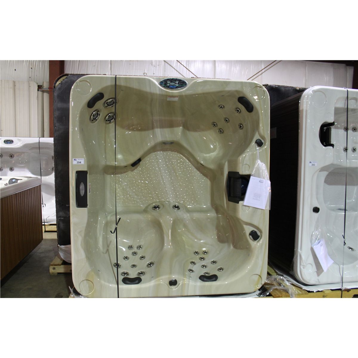 CAL SPAS BENCH SEAT HOT TUB, 76X84X35 PREFERRED TEAK CABINET WITH EL DORADO INTERIOR C/W 30 SS CANDY CANE JETS, 4 PILLOWS, GATE VALVE, 50 SQ FT SURFACE FILTER WITH WIER GATE, CASCADING WATERFALL, 5 BHP 2 SPEED PUMP, PURE-SILK OZONATOR, LED SPA LIGHT, PREM