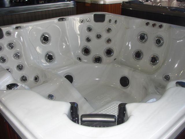 CAL SPAS COLEMAN SERIES HOT TUB WITH IVORY INTERIOR AND MAHOGANY CABINET. FEATURES INC: 66 SS JETS, COMFORT LOUNGER, FOOT MASSAGER, 2 X EXTRA DEEP MASSAGE SEATS, 75 SQ FT FILTER WITH WEIR GATE, THREE PORT LED WATER FEATURE, 5.5 KW HEATER, 3 X 5 HP PUMPS PURE SILK OZONATOR, 3 PILLOWS AND MORE... S/N 008283