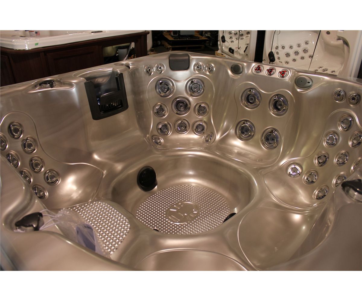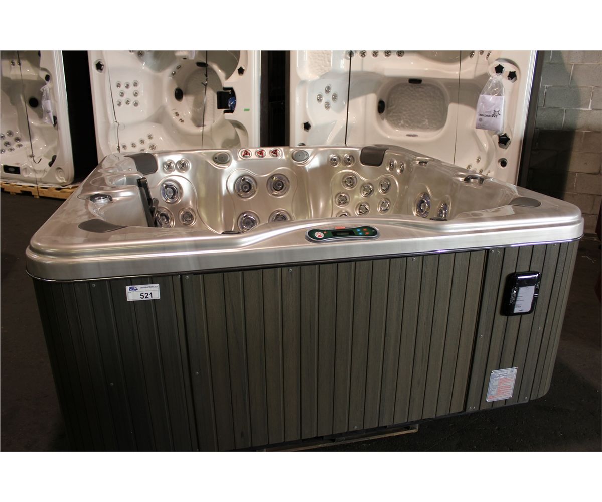 CAL SPAS COLEMAN SERIES HOT TUB WITH OYSTER OPAL INTERIOR AND 7' LIGHT GREY CABINET. C/W: 56 SS CLEAR JETS, BENCH SEATING, ISOUND STEREO WITH IPOD DOCK AND SPEAKERS, 3 PORT LED WATER FEATURE, 2 X 6.0 HP PUMPS WITH GREEN PACK, PURE SILK OZONATOR, FLOOR DRAIN 24 HOUR FILTRATION, 4 PILLOWS, HI-LIGHT LED JETS WITH CONTROL VALVES, S/N 002455