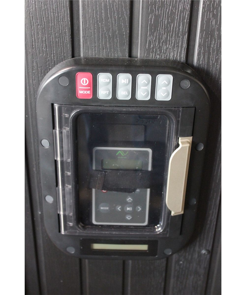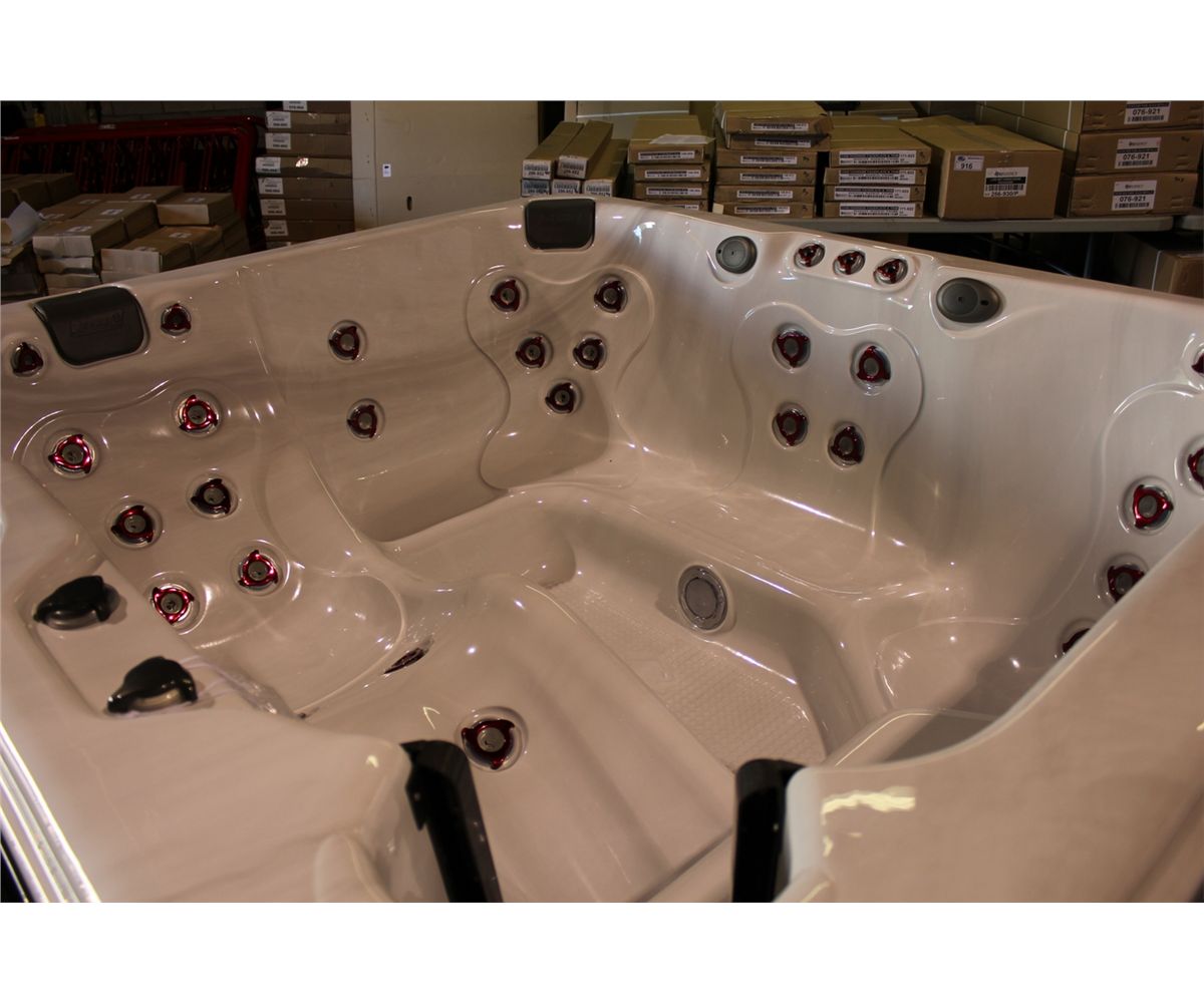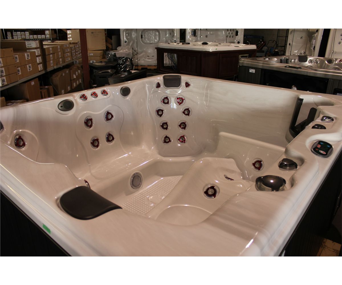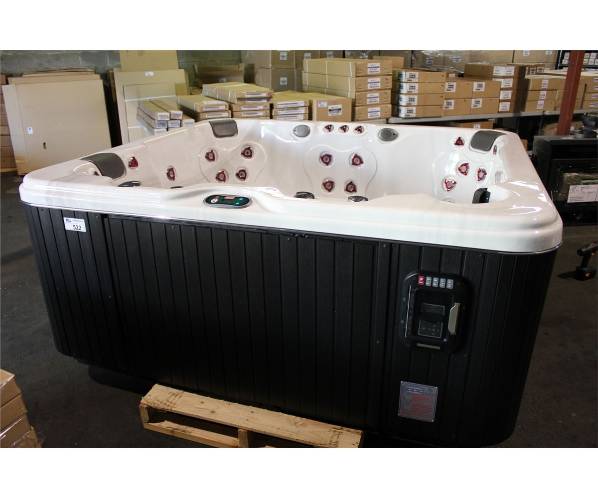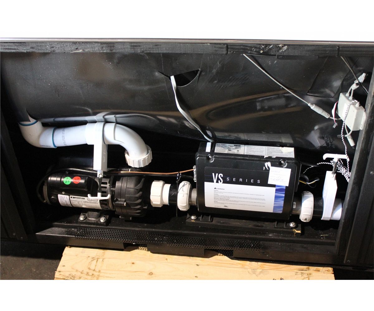 CAL SPAS COLEMAN SERIES HOT TUB WITH WHITE INTERIOR AND CHARCOAL 74" X 84" CABINET. C/W: 37 SS CLEAR RED JETS, 5.0 HP BHP PUMP, PURE SILK OZONATOR, THREE PORT LED WATER FEATURE, LED SPA LIGHT, XIM SOUND STEREO SYSTEM WITH 4" POLY PLANNER SPEAKERS AND REMOTE CONTROL LOUNGER, HI-LIGHT LED JETS, 50 SQ FT PURE FLOW FILTER AND MORE..... S/N 008279