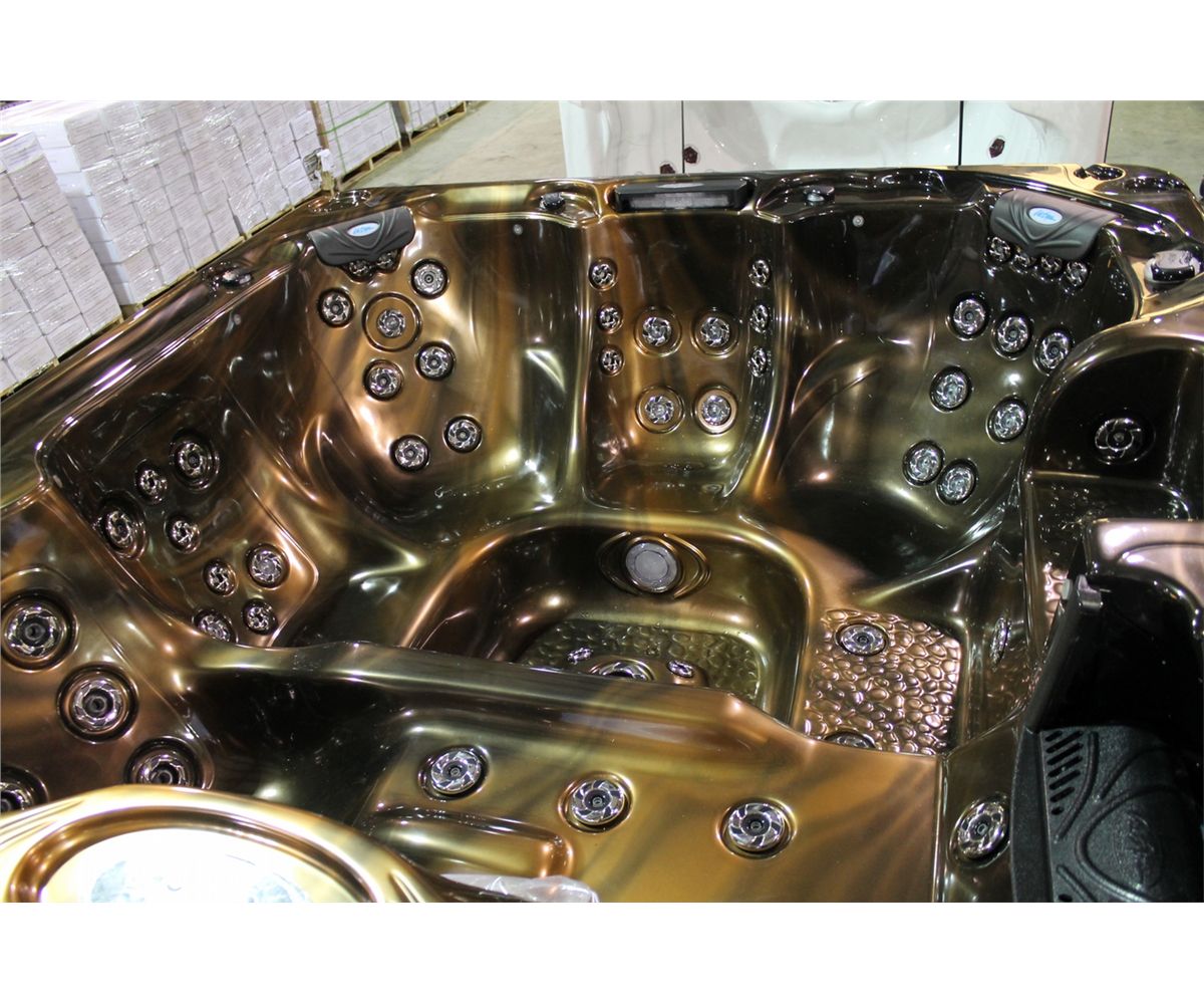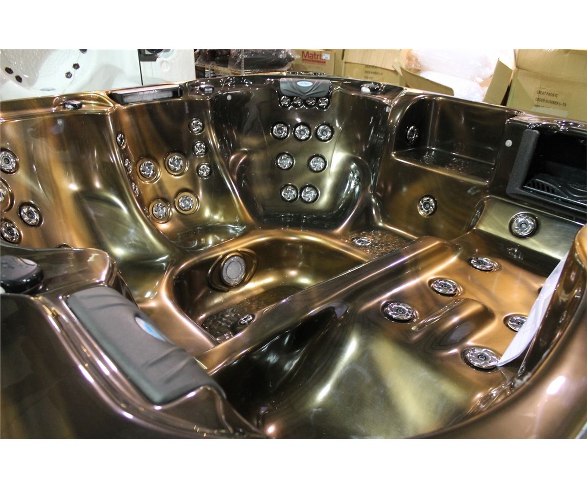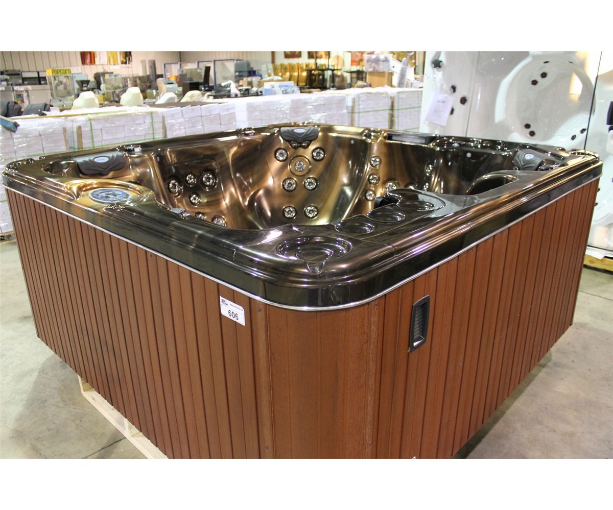 CAL SPAS CONNECT LOUNGER HOT TUB, 8'X8' PREFERRED MAHOGANY CABINET WITH AZURA INTERIOR C/W 50 SS CANDY CANE JETS, 3 INFINITY PILLOWS, GATE VALVE, 50 SQ FT SURFACE FILTER WITH WIER GATE, CASCADING WATERFALL, 5.5 WHISPER QUIET HEATER, 2 X 5 BHP PUMPS PURE-SILK OZONATOR, LED SPA LIGHT, SHELL LOC THERMO LAYER CABINET AND MORE.