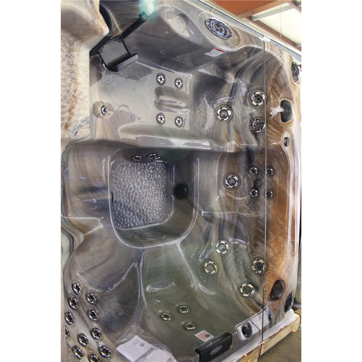 CAL SPAS CONNECT LOUNGER HOT TUB, 8'X8' PREFERRED MAHOGANY CABINET WITH TUSCAN SUN INTERIOR C/W 36 SS CANDY CANE JETS, LES ISOUND SYSTEM IPOD STATION WITH 4 X 6" SPEAKERS, 3 INFINITY PILLOWS, GATE VALVE, CASCADING WATERFALL, 5.5 KW HEATER, 2 X 5 BHP PUMPS, PURE SILK OZONATOR, PREMIUM LED PERIMETER LIGHTING, LED SPA LIGHT, 50 SQ FT. SURFACE FILTER WITH WIER GATE UNI-CABINET AND MORE