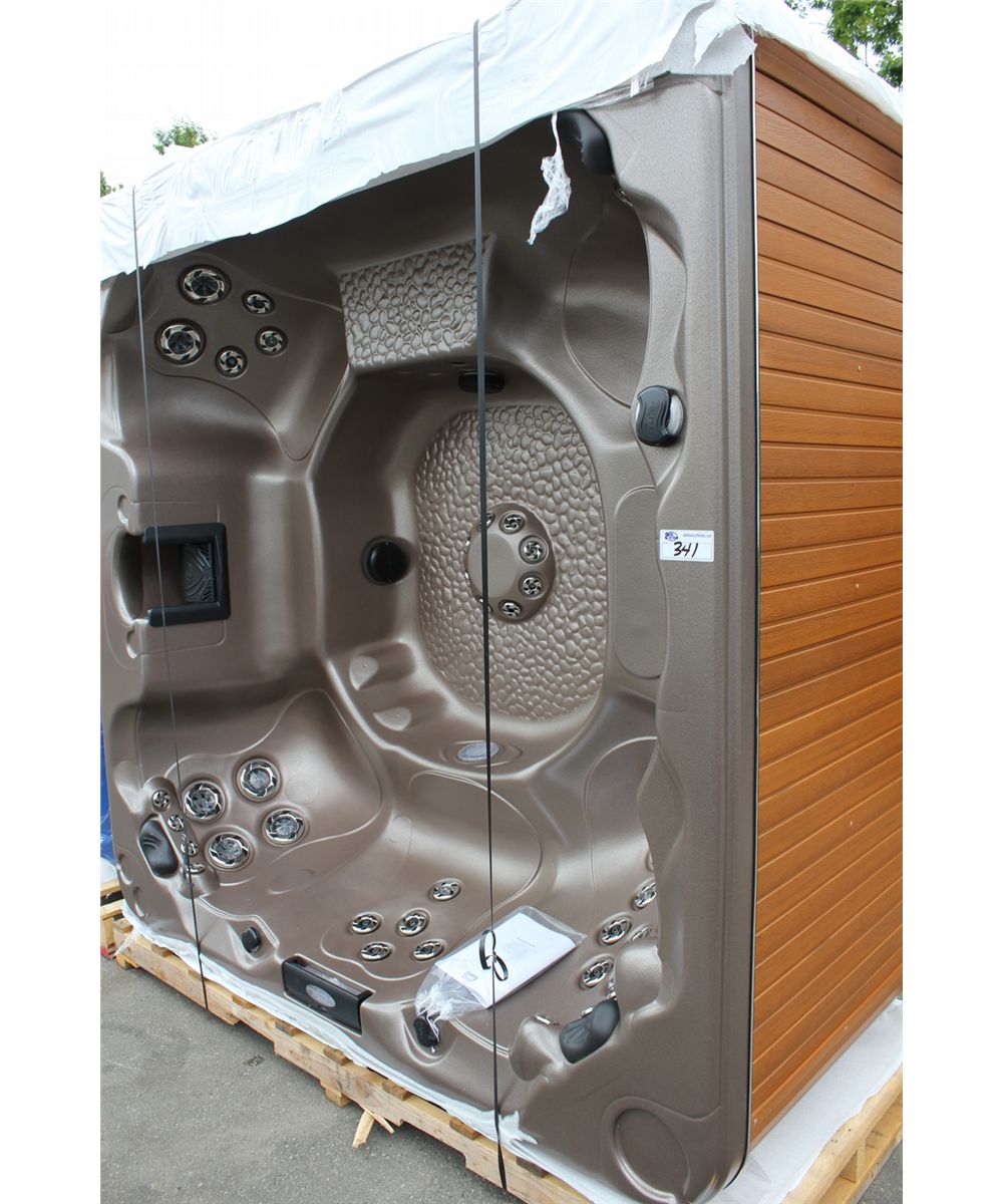 CAL SPAS CONNECT SELECT SERIES HOT TUB WITH SAHARA INTERIOR AND PREFERRED MIST 8'CABINET C/W 36 SS CANDY CANE JETS, BENCH SEATING, WHISPER QUIET 5.5 KW HEATER, 2 X 5 BHP PUMPS, 3 INFINITY PILLOWS, 50 SQ FT FILTER WITH WIER GATE, WATERFALL CASCADE, LED SPA LIGHT 4 QUAD BLASTER JETS, PURE SILK OZONATOR, CONNECT INTERIOR PERIMETER LED LIGHTING, LED SPA LIGHT, ISOUND STEREO IPOD STATION WITH 4 6" SPEAKERS, BOTTOM TRAY WITH THERM LOC AND MORE. SER. 007892