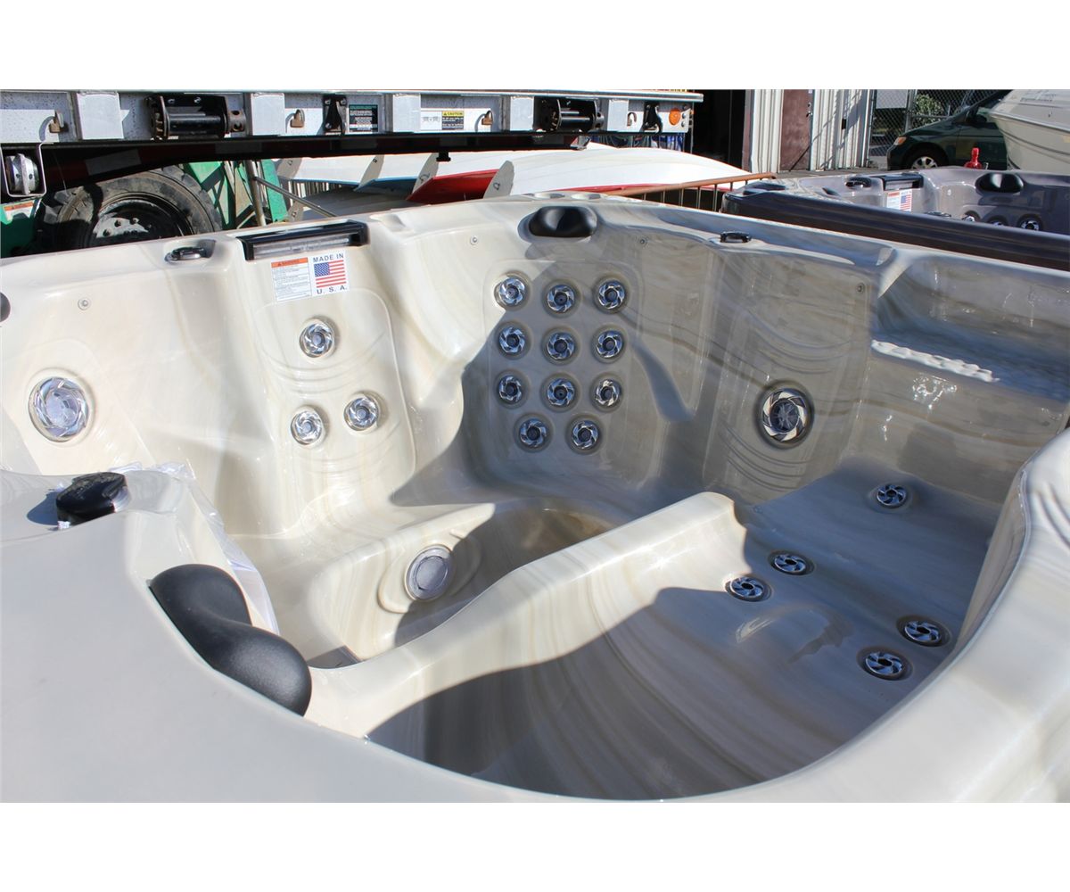 CAL SPAS CONNECT SELECT SERIES HOT TUB WITH SAND INTERIOR AND 7' TEAK CABINET. C/W: 36 SS CANDY CANE JETS, 3 INFINITY PILLOWS, WATERFALL CASCADE, TITANIUM 5.5 KW HEATER, 2 X 5.0 BHP PUMPS, FOOT MASSAGER, LOUNGER, 50 SQ FT FILTER WITH WIER GATE CUSTOM PEBBLE FLOORING, CONNECT INTERIOR PERIMETER LED LIGHTING, LED SPA LIGHT AND MORE.... S/N 004198