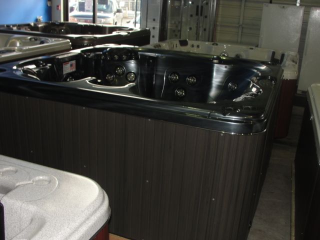 CAL SPAS CONNECT SERIES HOT TUB WITH MIDNIGHT OPA INTERIOR AND WALNUT CABINET. FEATURES INC: 41 SS JETS INC: 8 QUAD BLASTER JETS AND TORNADO DOME FOOT MASSAGER WITH 2" DIVERTER, 5100 WHISPER QUIET HEATER, 2 X 5 BHP PUMPS, CONNECT INTERIOR LIGHTING, 7.5' CABINET, WATERFALL, 2 X CAL SEATS WITH SHOULDER MASSAGERS, VARYING HEIGHT BENCH SEATING, CUSTOM PEBBLE FLOORING AND MORE..... S/N 007398