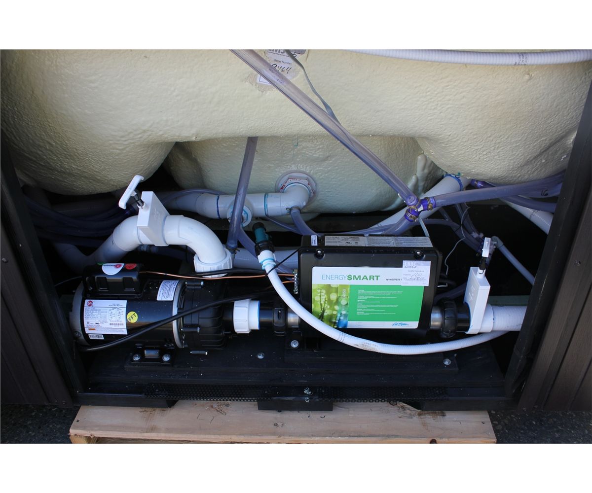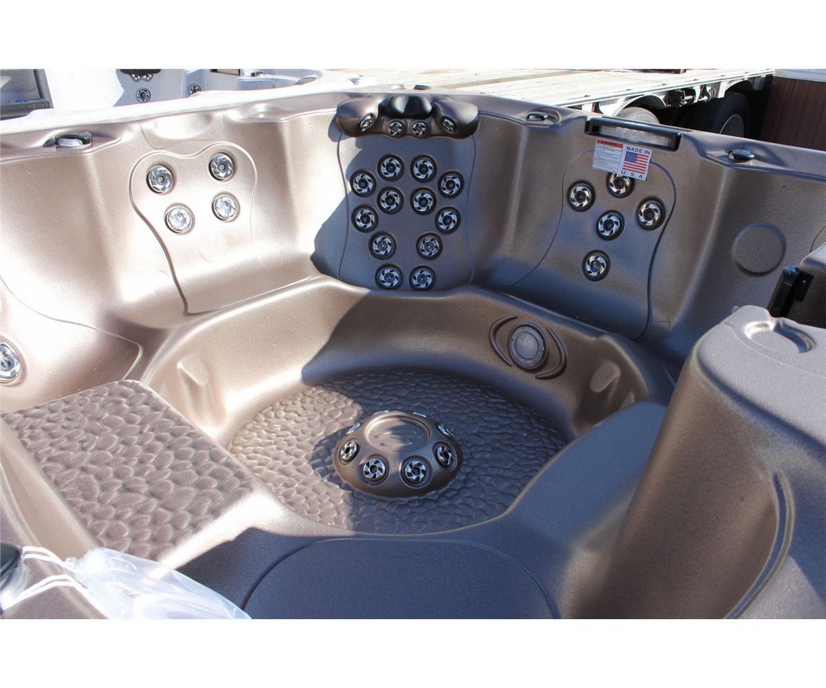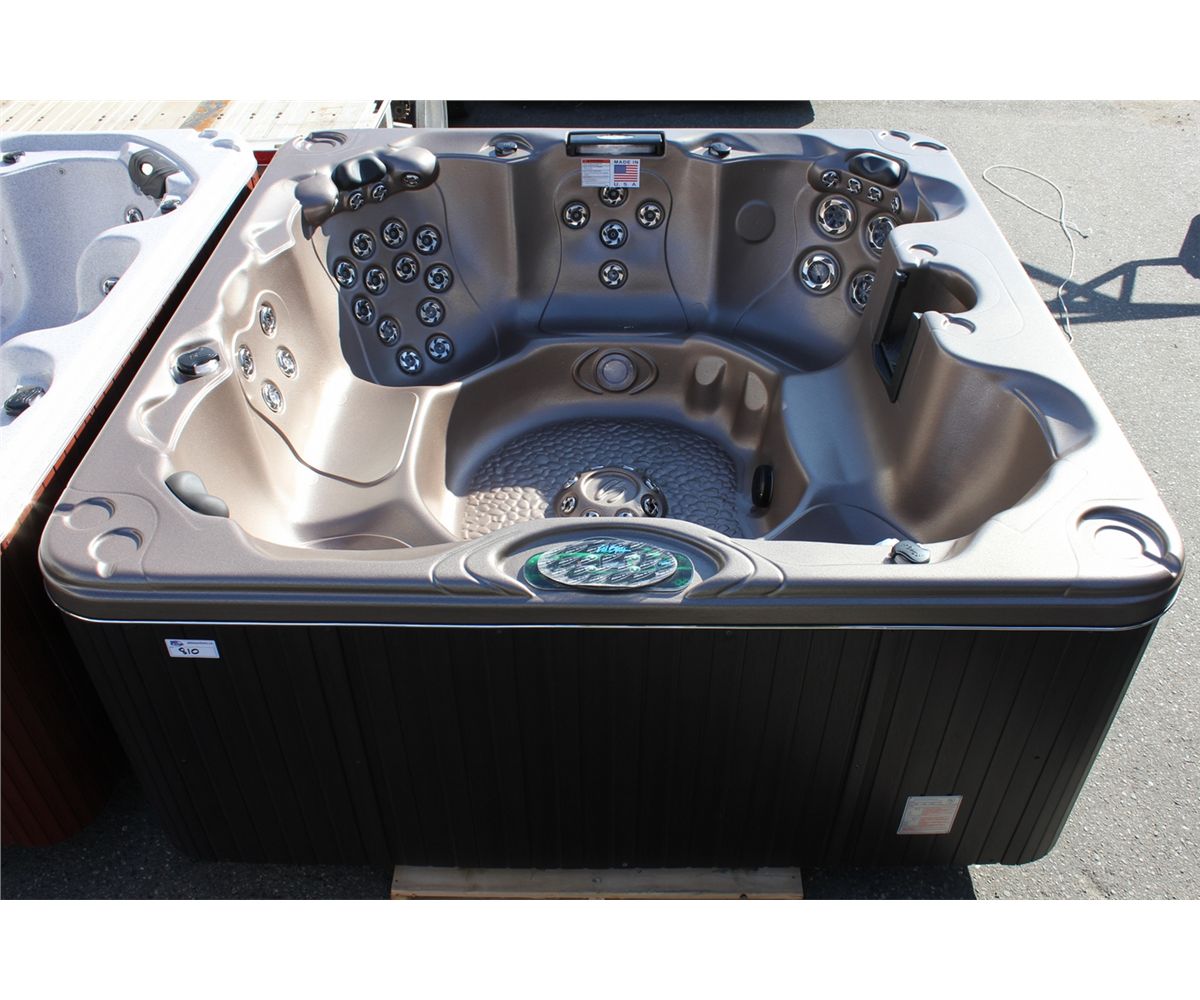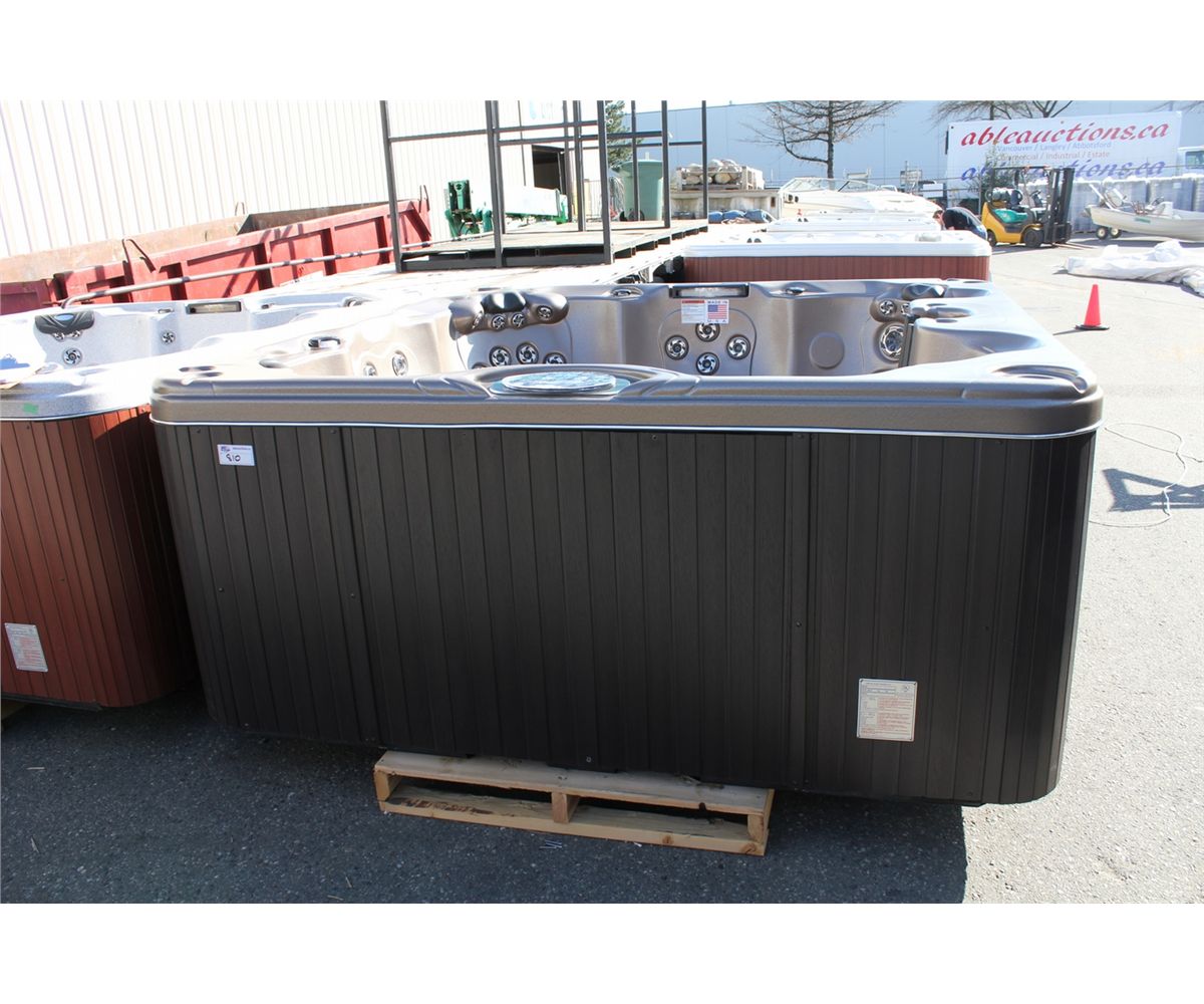 CAL SPAS CONNECT SERIES HOT TUBE WITH CINNABAR INTERIOR AND 8' MAHOGANY CABINET. C/W: 50 SS CANDY CANE JETS, GATE VALVE, CENTER CONSOLE FOOT MASSAGER, CUSTOM PEBBLE FLOORING, WATERFALL CASCADE, PURE CURE UV SANITIZING SYSTEM, LED SPA LIGHT, 2 X 5.0 HP PUMPS 3 PILLOWS, 50 SQ FT FILTER WITH WIER GATE, S/N 008464