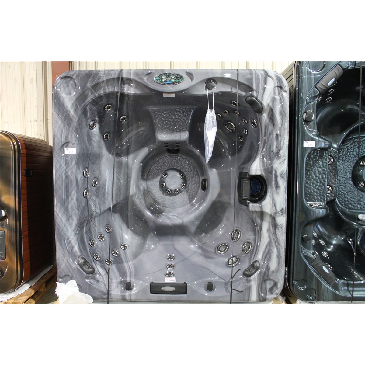 CAL SPAS ECO DUALLY HOT TUB, 7' X 7' PREFERRED SMOKE CABINET WITH STORM CLOUD INTERIOR C/W 36 SS CANDY CANE JETS, 3 INFINITY PILLOWS, GATE VALVE, 50 SQ FT SURFACE FILTER WITH WIER GATE, CASCADING WATERFALL, 5.5 KW HEATER, DUALLY PUMP, PURE-SILK OZONATOR, QUIET CLEAN FILTRATION SYSTEM, PREMIUM LED PERIMETER LIGHTING, LED SPA LIGHT, 2 X FRONT CORNER LIGHTING AND MORE!