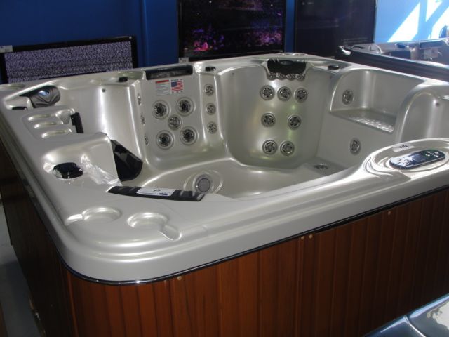 CAL SPAS ESCAPE SELECT SERIES HOT TUB WITH IVORY INTERIOR AND TEAK CABINET. FEATURES INC: 64 SS CANDY CANE JETS, 4 PILOWS, 5100 TITANIUM 5.5 KW HEATER, 2 X 5 BHP PUMPS, CONNECT INTERIOR PERIMETER LIGHTING, LED SPA LIGHT, 100 SQ FT FILTER WITH WIER GATE CENTRE CONSOLE FOOT MASSAGER, CUSTOM PEBBLE FLOORING, VARYING DEPTH BENCH SEATING, WATERFALL CASCADE, AND MORE...... S/N 005602