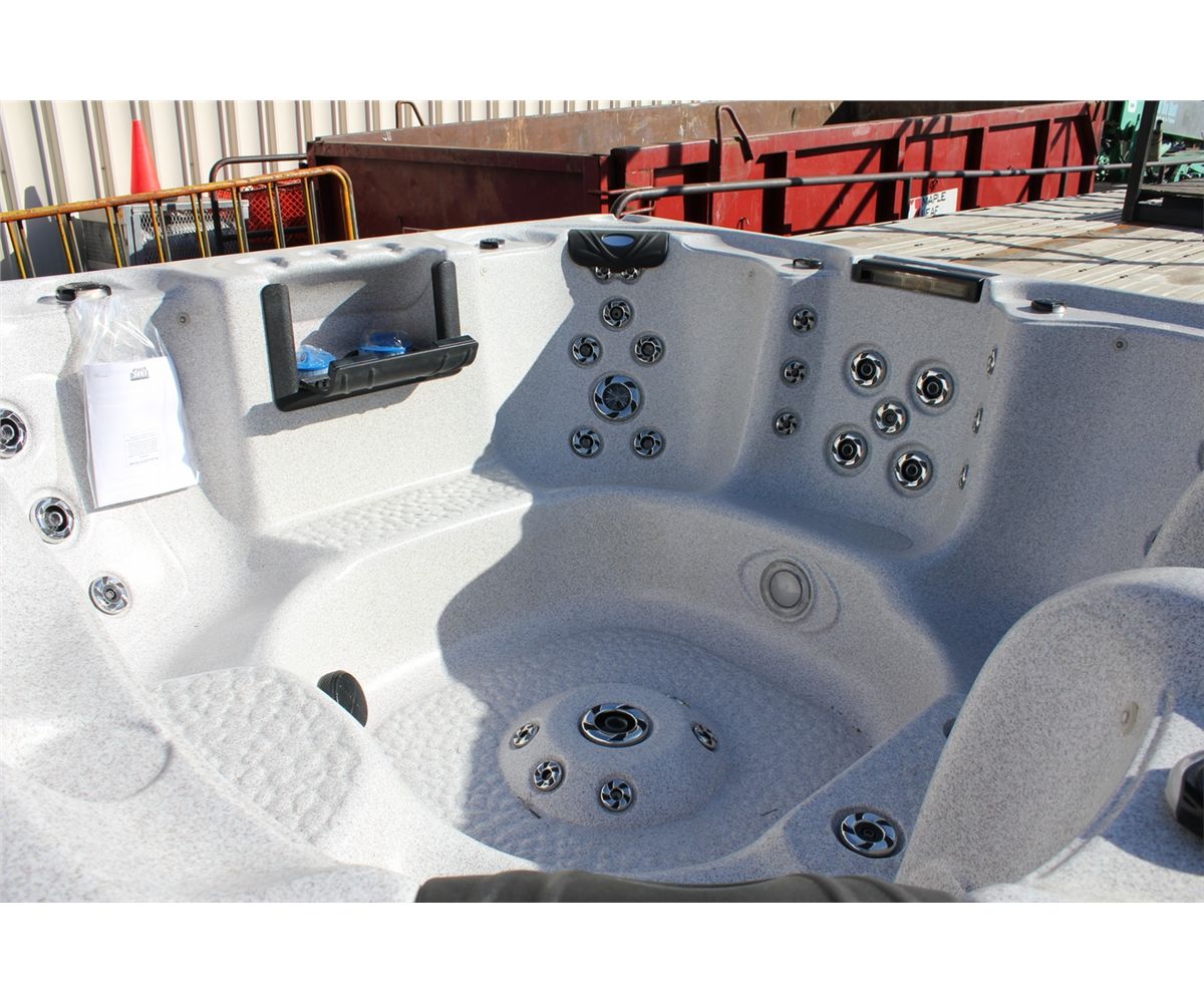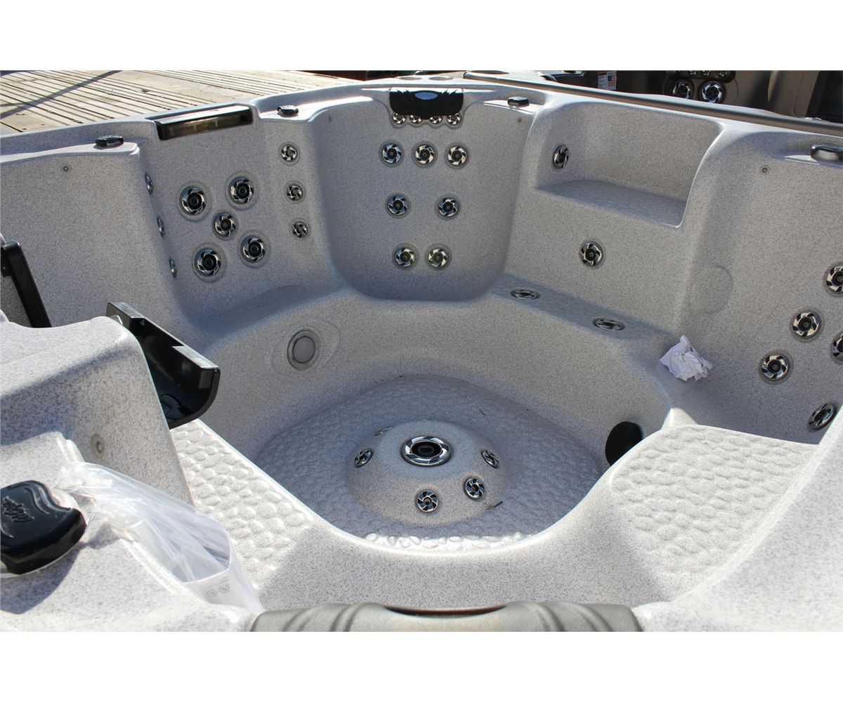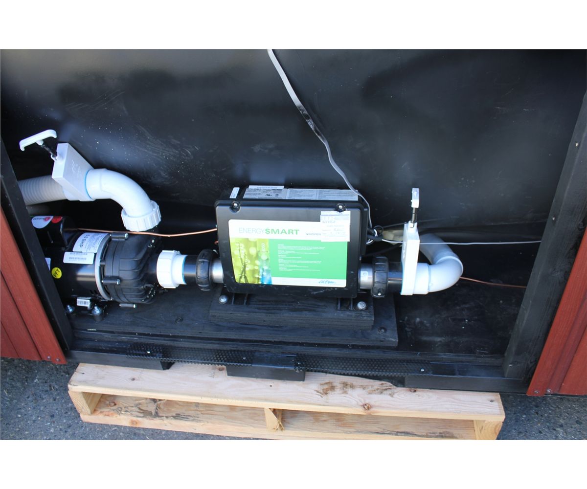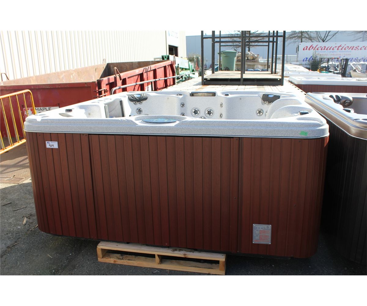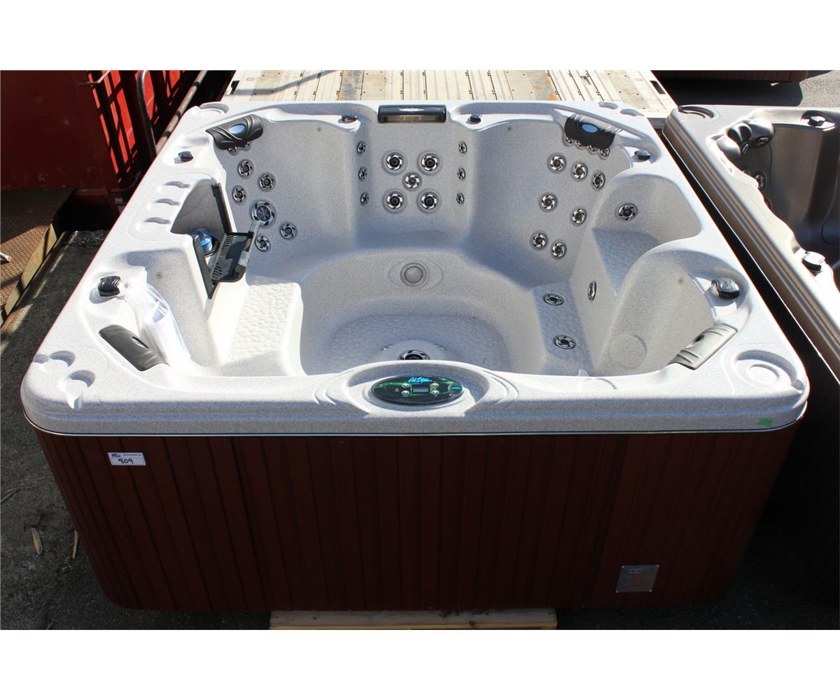 CAL SPAS ESCAPE SELECT SERIES HOT TUBE WITH SAHARA INTERIOR AND 8' MAHOGANY CABINET. C/W: 64 SS CANDY CANE JETS, BENCH SEATING, CENTRAL FOOT MASSAGER, 4 PILLOWS, WATERFALL CASCADE, GATE VALVE, 5.5 KW TITANIUM HEATER, 2 X 5.0 HP PUMPS, DUAL FILTER CONNECT INTERIOR PERIMETER LED LIGHTING, LED SPA LIGHT, 4 PILLOWS, CABINET ACCESSIBLE DRAIN VALVE, AND MORE...... S/N 006238