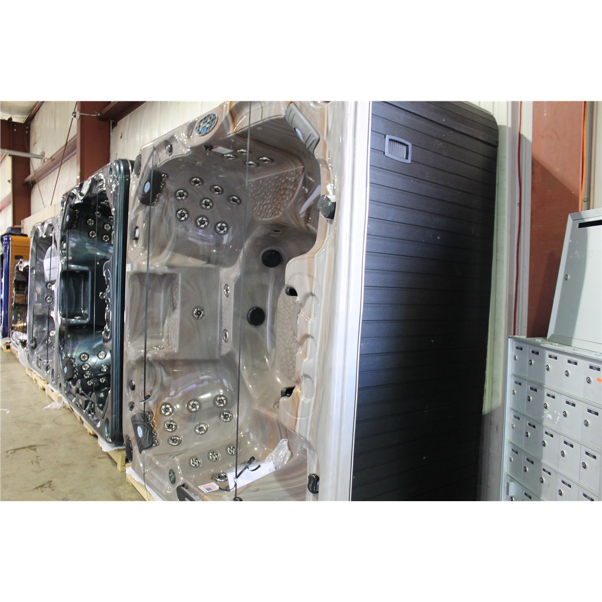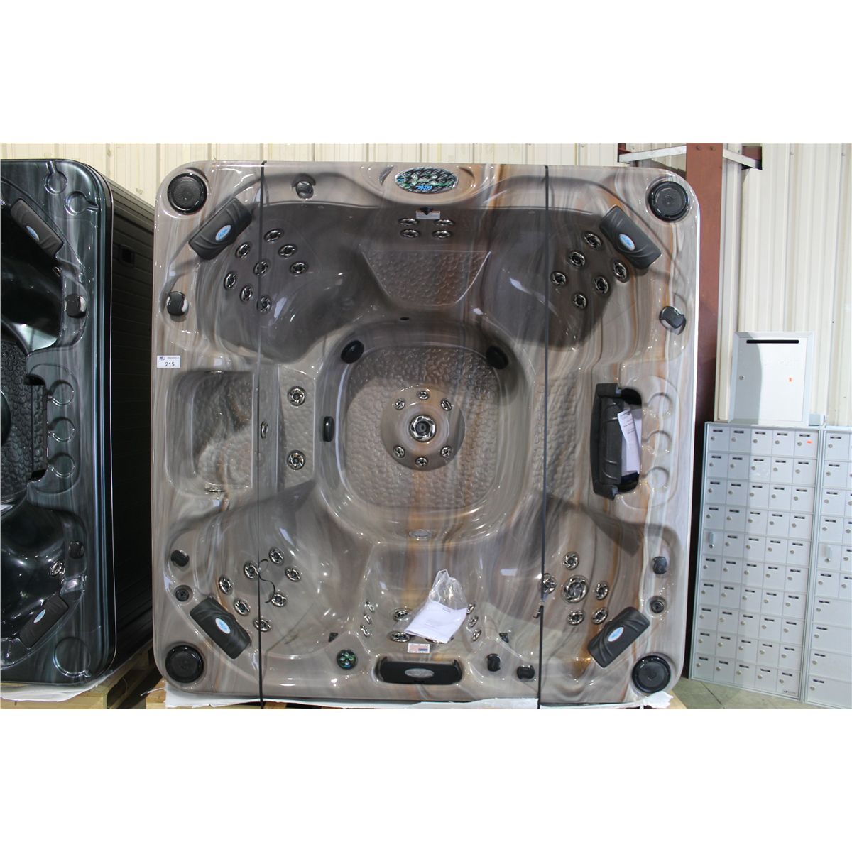 CAL SPAS ESCAPE SERIES LOUNGER HOT TUB, 8' X 8' PREFERRED BLACK CABINET WITH SUNSET STORM INTERIOR C/W 64 SS CANDY CANE JETS, CASCADING WATERFALL, 4 PILLOWS, 5.5KW HEATER, 2 X 6 HP PUMPS, EXCLUSIVE ADJUSTABLE THERAPY SYSTEM, VALVE LED LIGHTING, CONNECT INTERIOR PERIMETER LIGHTING, HI-LITE LED JETS WITH CONTROL VALVES, LED DUAL HYDRO-STREAMERS WITH VALVE, LED SPA LIGHT, BLUETOOTH SOUND SYSTEM WITH 4 X 6" SPEAKERS AND MORE