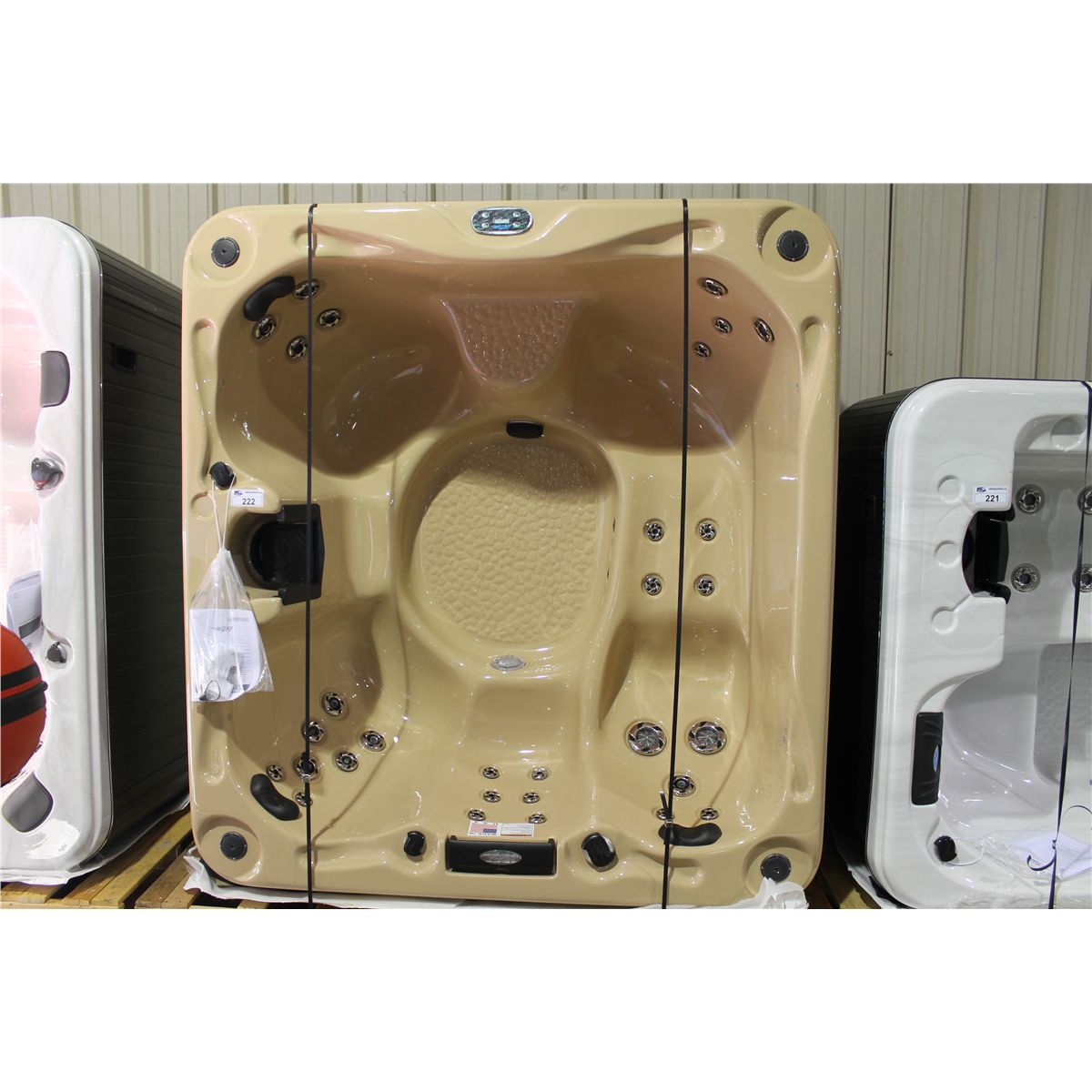 CAL SPAS EURO LOUNGER HOT TUB, 78X84X32 COPPER CABINET WITH PLATINUM SWIRL INTERIOR C/W 30 SS CANDY CANE JETS, 3 INFINITY PILLOWS, 50 SQ FT SURFACE FILTER WITH WIER GATE, GATE VALVE, CASCADING WATERFALL, 5.5 KW HEATER, 5 BHP PUMP, PURE-SILK OZONATOR EXCLUSIVE HI-LIGHT LET LED LIGHTING, CONNECT INTERIOR PERIMETER LED LIGHTING, LED SPA LIGHT, EASY ACCESS CABINET AND MORE
