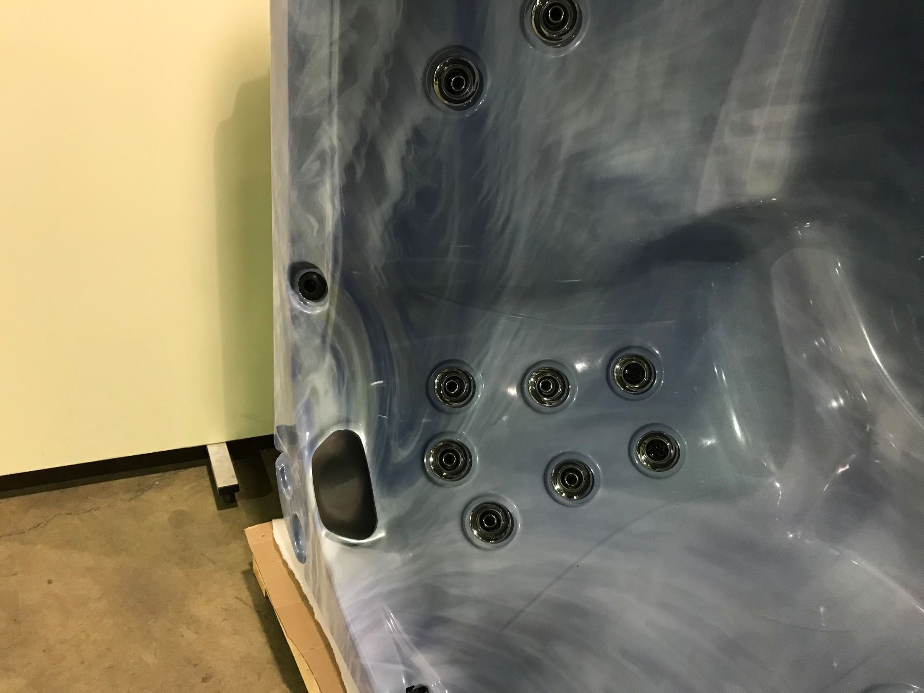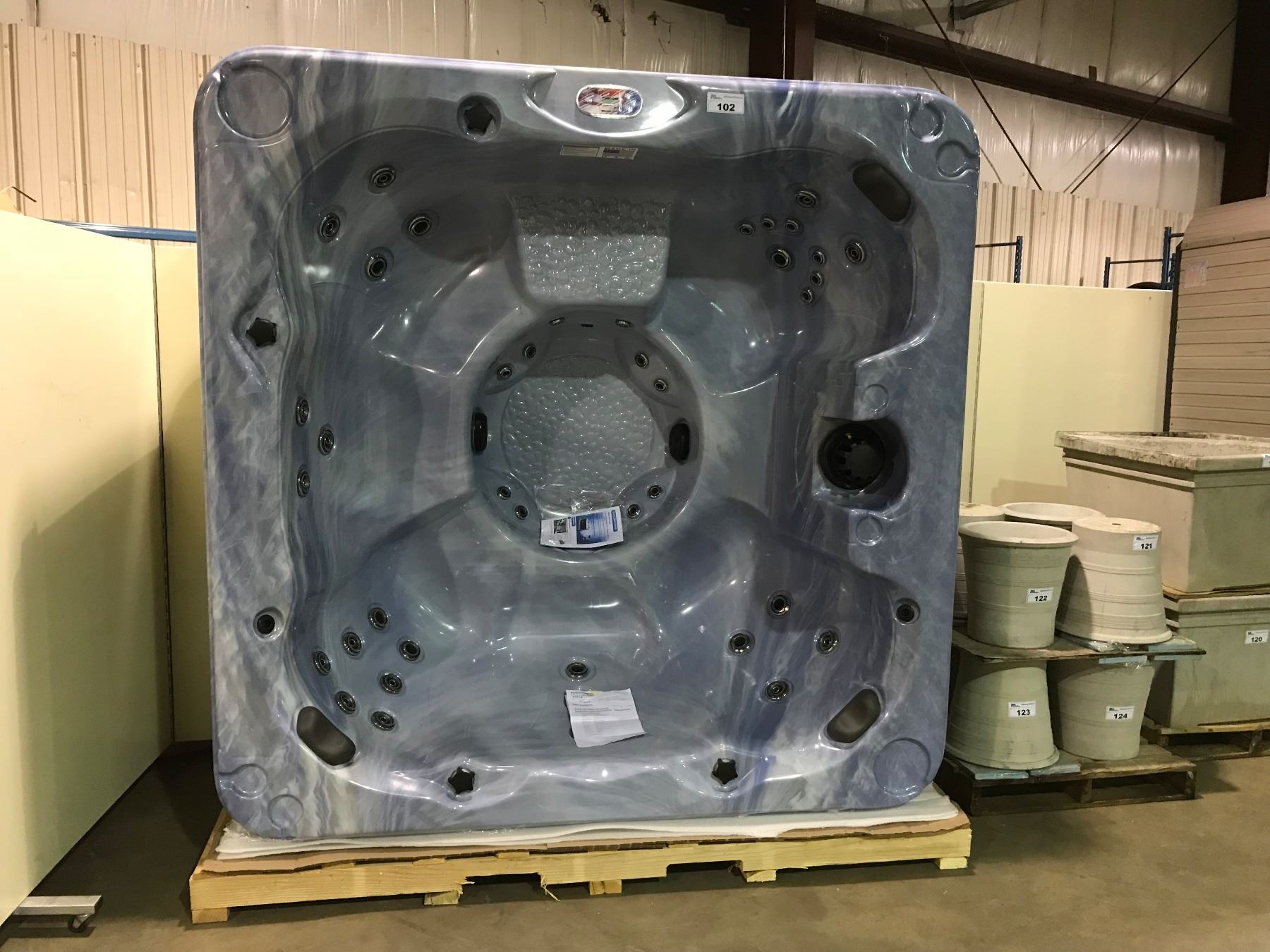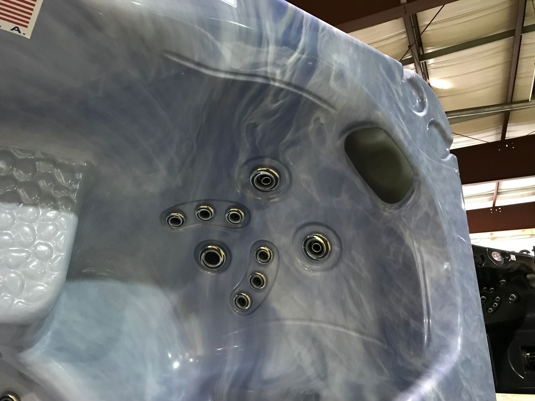 CAL SPAS HEAVEN 7' X 7' HOT TUB WITH 40 HALO SS JETS, 3 PILLOWS, 5.5 KW HEATER, 50 SQ FT FILTER, 6 BHP 2 SPD PUMP, 5 BHP PUMP, LED DUAL HYDRO STREAMERS, LED SPA LIGHT, THERMO-LAYER, ABS LINER, HYDROCLEAR OZONATOR, , CALF MASSAGER, PHAUX PEBBLE FINISH, SURFACE SKIMMER AND MORE. SER. # 005219