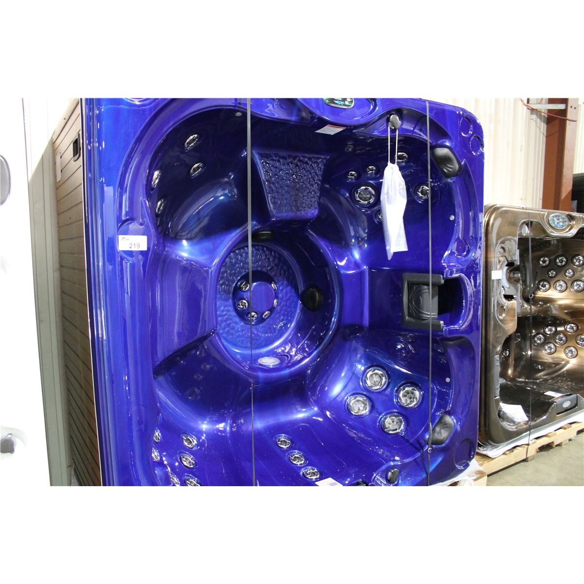 CAL SPAS LIMITED EDITION HOT TUB, 7'X7' PREFERRED SMOKE CABINET WITH TOURMALINE BLUE INTERIOR C/W 36 SS CANDY CANE JETS, 3 INFINITY PILLOWS, GATE VALVE, 50 SQ FT FILTER WITH WIER GATE, CASCADING WATERFALL, 4 FREE STYLE QUAD BLASTER JETS, 5100 WHISPER QUIET 5.5 KW HEATER, 2 X 5BHP PUMPS, PURE-SILK OZONATOR , LED SPA LIGHT, PREMIUM LED PERIMETER LIGHTING AND MORE!!