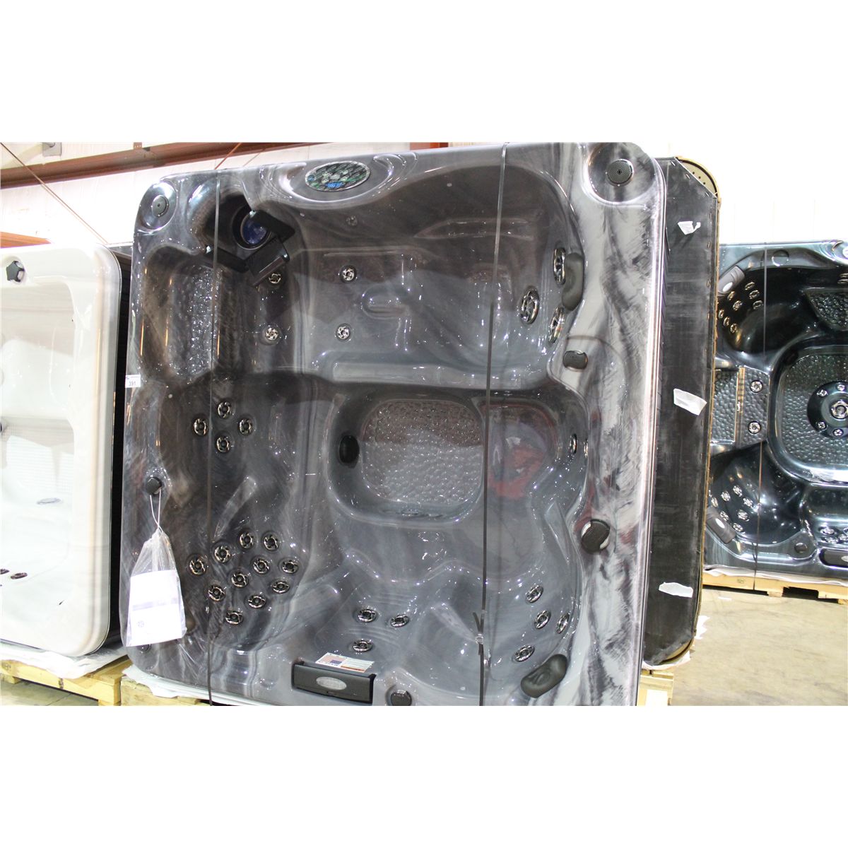 CAL SPAS PATIO LOUNGER HOT TUB, 7.5'X7.5' PREFERRED SMOKE CABINET WITH STORM CLOUD INTERIOR C/W 31 JETS, LES ISOUND SYSTEM IPOD STATION WITH 4 X 4" SPEAKERS, 3 INFINITY PILLOWS, GATE VALVE, 50 SQ FT SURFACE FILTER WITH WIER GATE, 5.5 KW HEATER, 2 X 5 BHP PUMP, LED SPA LIGHT, PREMIUM LED PERIMETER LIGHTING, 2 X FRONT CORNER LED LIGHTING, SHELL-LOC THERMO LAYER UNI CABINET AND MROE.