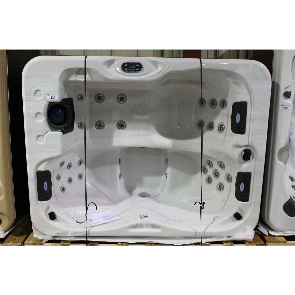 CAL SPAS PATIO LOUNGER HOT TUB, 84X64X35 PREFERRED SMOKE CABINET WITH CINNABAR INTERIOR C/W 36 SS CANDY CANE JETS, 3 PILLOWS, GATE VALVE, 50 SQ FT FILTER WITH WIER GATE, 5.5 KW HEATER, 5 BHP PUMP, PURE-SILK OZONATOR, PREMIUM LED PERIMETER LIGHTING, LED SP