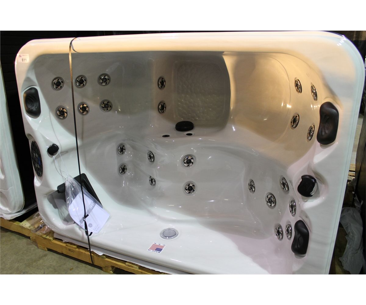 CAL SPAS PATIO SERIES HOT TUB, 54X78X32 PREFERRED SMOKE CABINET WITH STERLING SILVER INTERIOR C/W 24 SS CANDY CANE JETS, GATE VALVE, 50 SQ FT SURFACE FILTER WITH WEIR GATE, 5.5 KW HEATER, 2 BHP 2 SPEED PUMP, 110 VOLT CONVERSION KIT, PURE-SILK OZONATOR 3 I