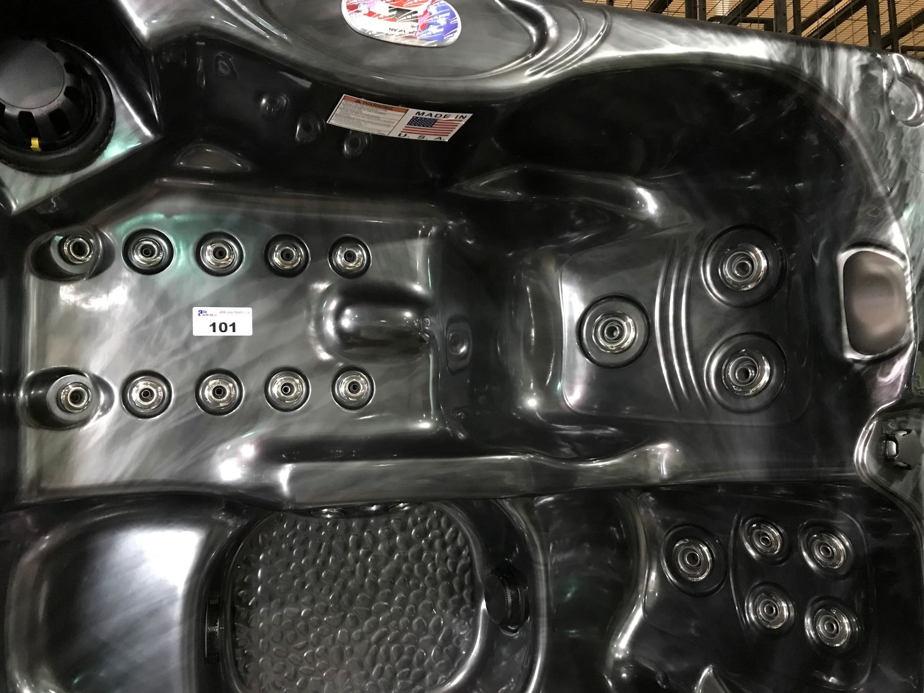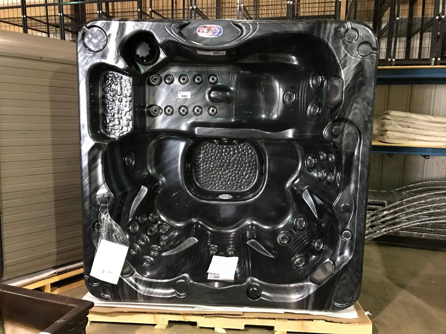 CAL SPAS PEARL 7' X 7' HOT TUB WITH 40 HALO SS JETS, 3 PILLOWS, 5.5 KW HEATER, 50 SQ FT FILTER, 6 BHP 2 SPD PUMP, 5 BHP PUMP, LED DUAL HYDRO STREAMERS, LED SPA LIGHT, THERMO-LAYER, ABS LINER, HYDROCLEAR OZONATOR, LOUNGER, CALF MASSAGER, PHAUX PEBBLE FINISH, SURFACE SKIMMER AND MORE. SER. # 005220