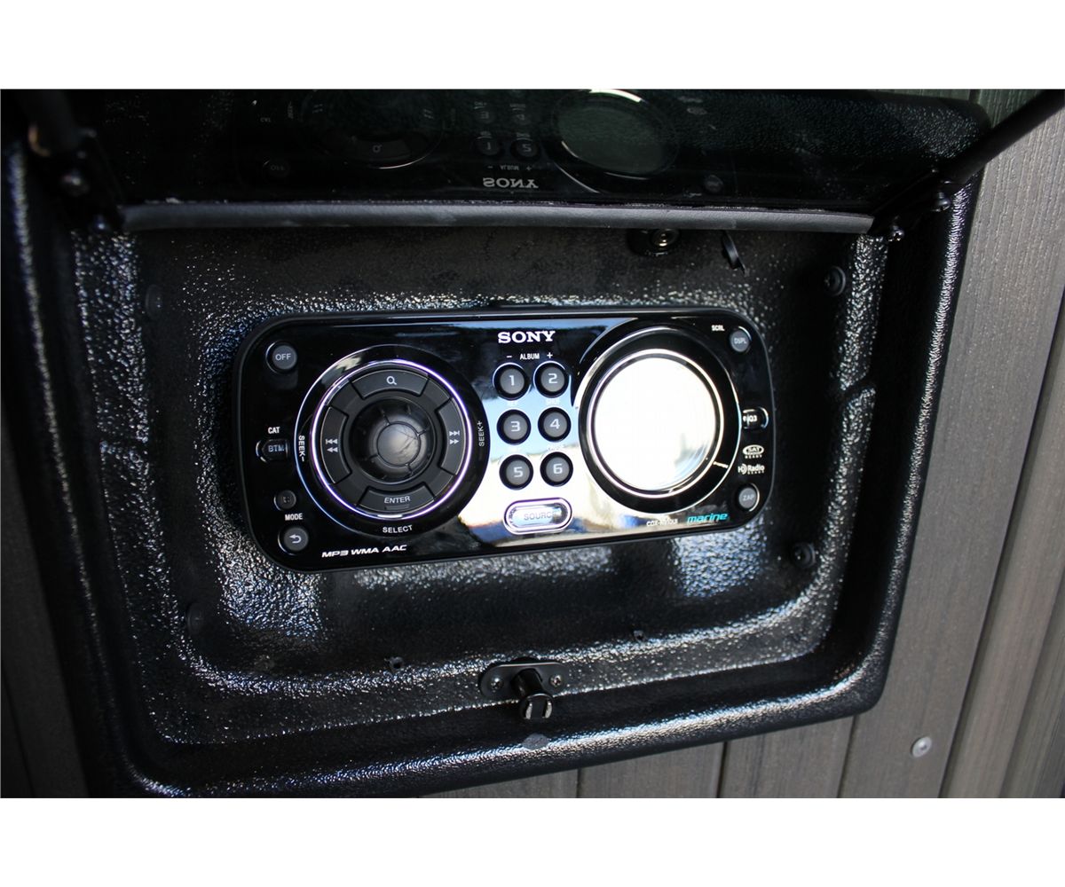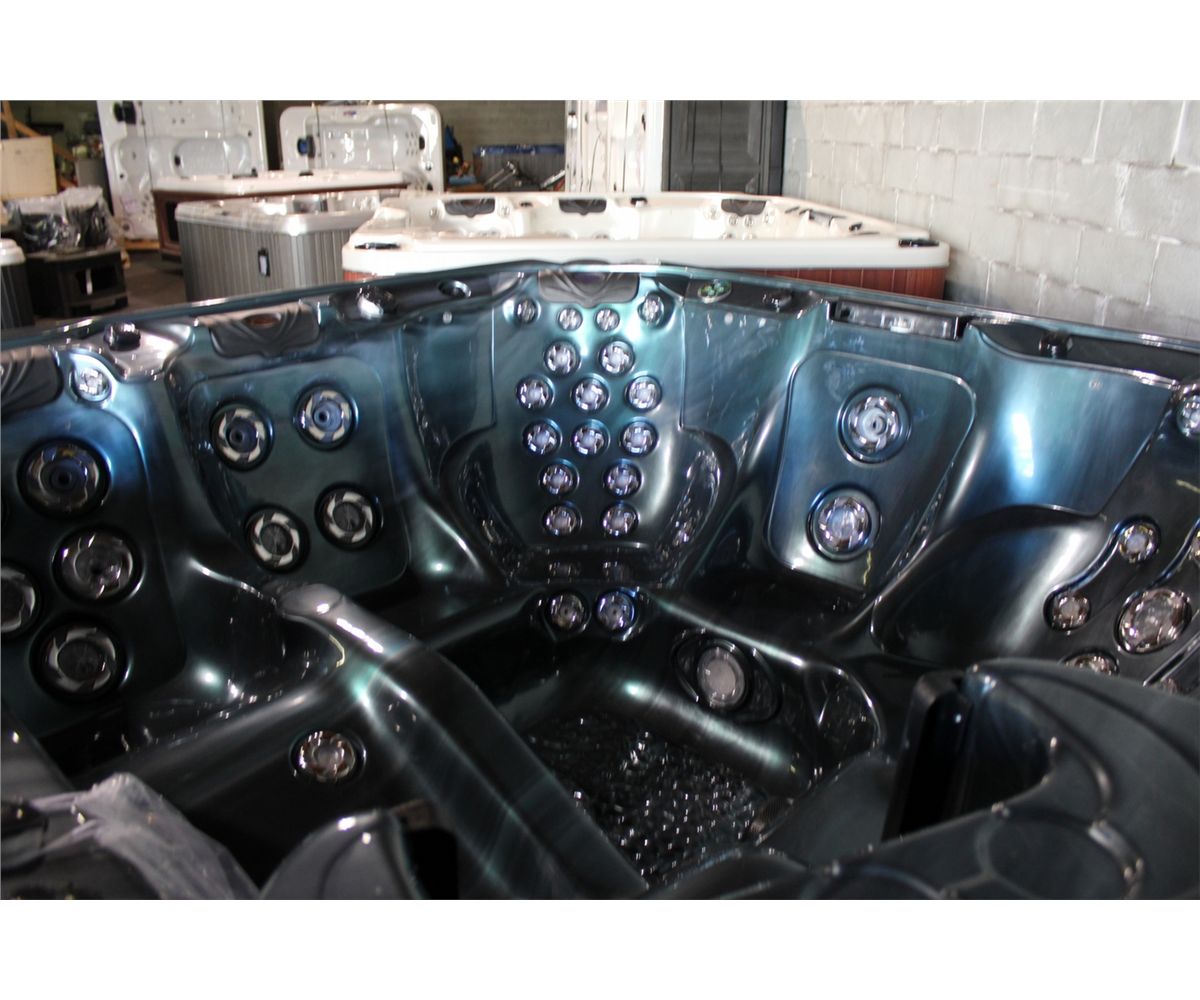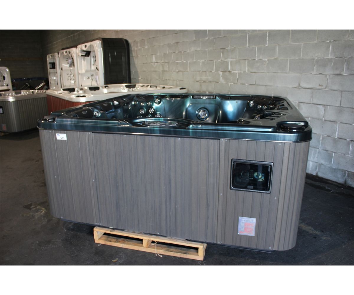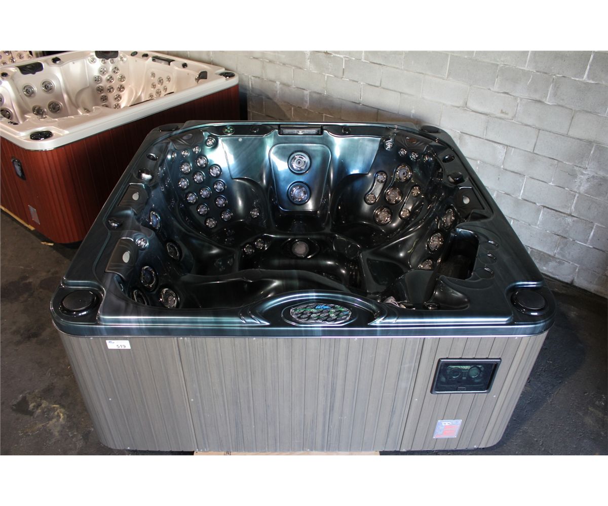 CAL SPAS PLATINUM SERIES HOT TUB WITH GALAXY INTERIOR AND 8' SMOKE GREY CABINET, C/W: 60 SS CANDY CANE JETS, WATERFALL CASCADE 2 X 5.0 HP BHP PUMPS, ADJUSTABLE THERAPY SYSTEM, PURE CURE U.V. SANITIZING SYSTEM DUAL CONTROL PANELS, FOOT MASSAGER, FLOOR DRAIN, LOUNGER, SONY MARINE STEREO SYSTEM WITH 4 X 6" SPEAKERS CD PLAYER AND MP3, LED INTERIOR AND JET LIGHTING, CD MANUAL, 5 PILLOWS, AND MORE. S/N 005677