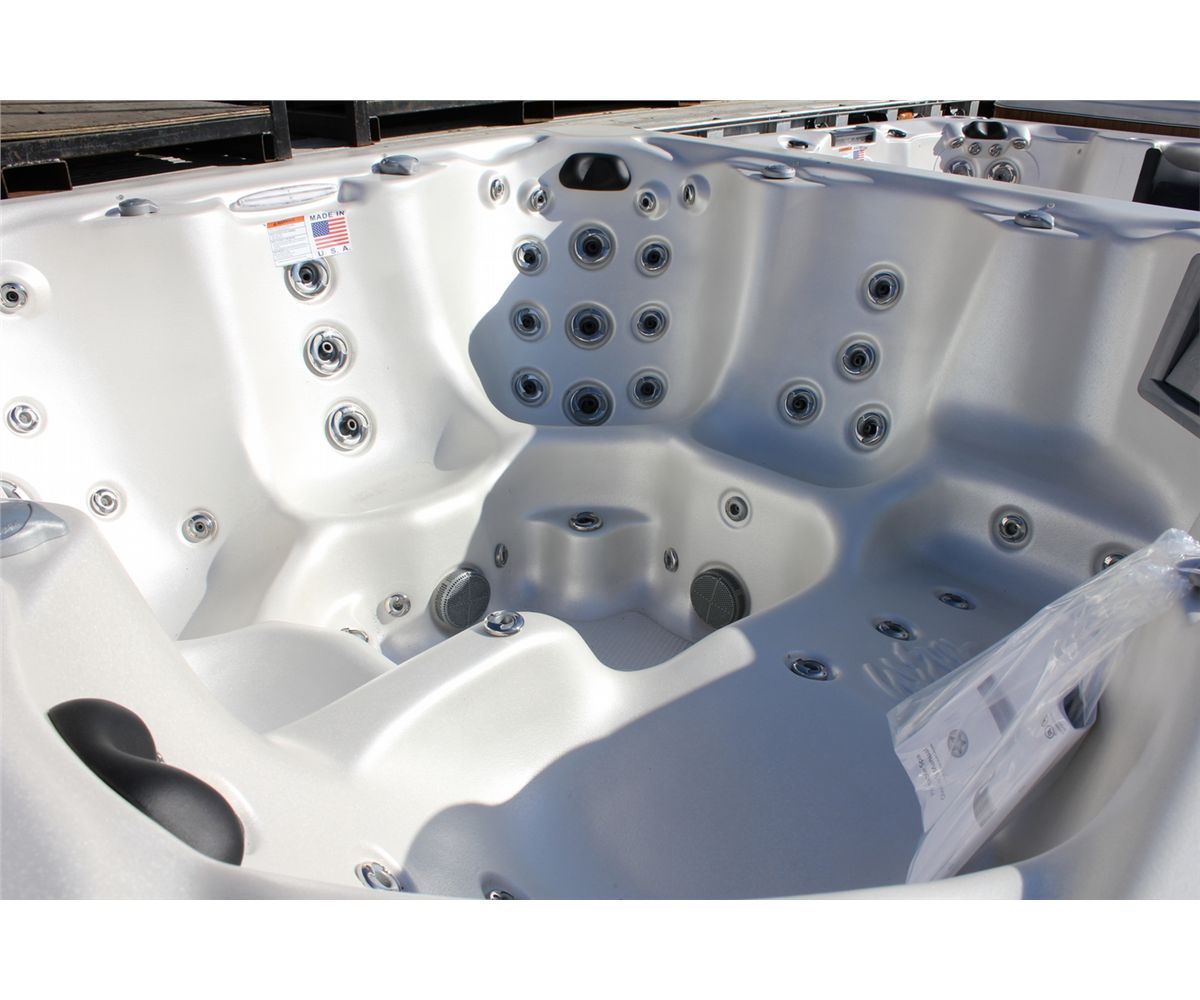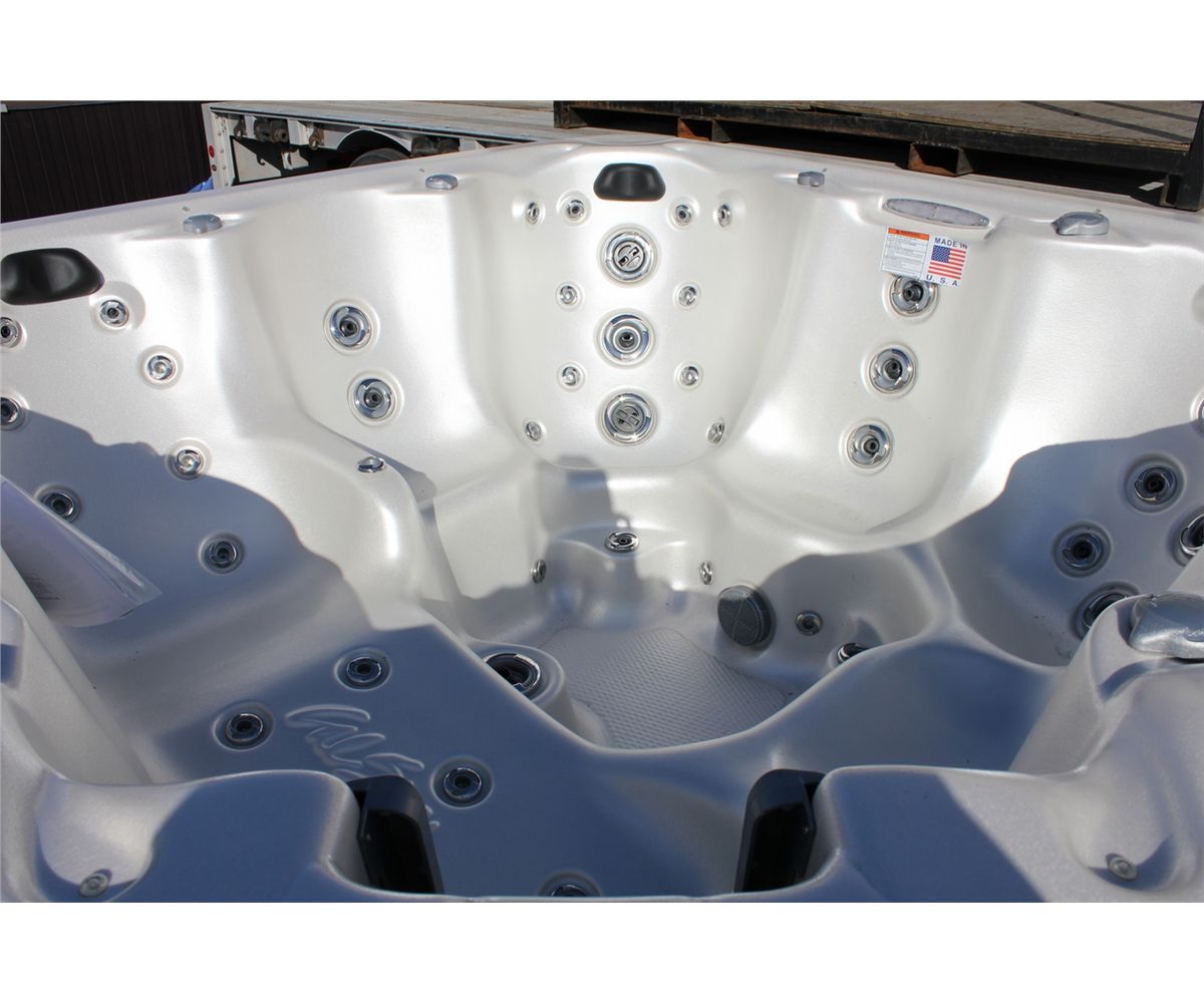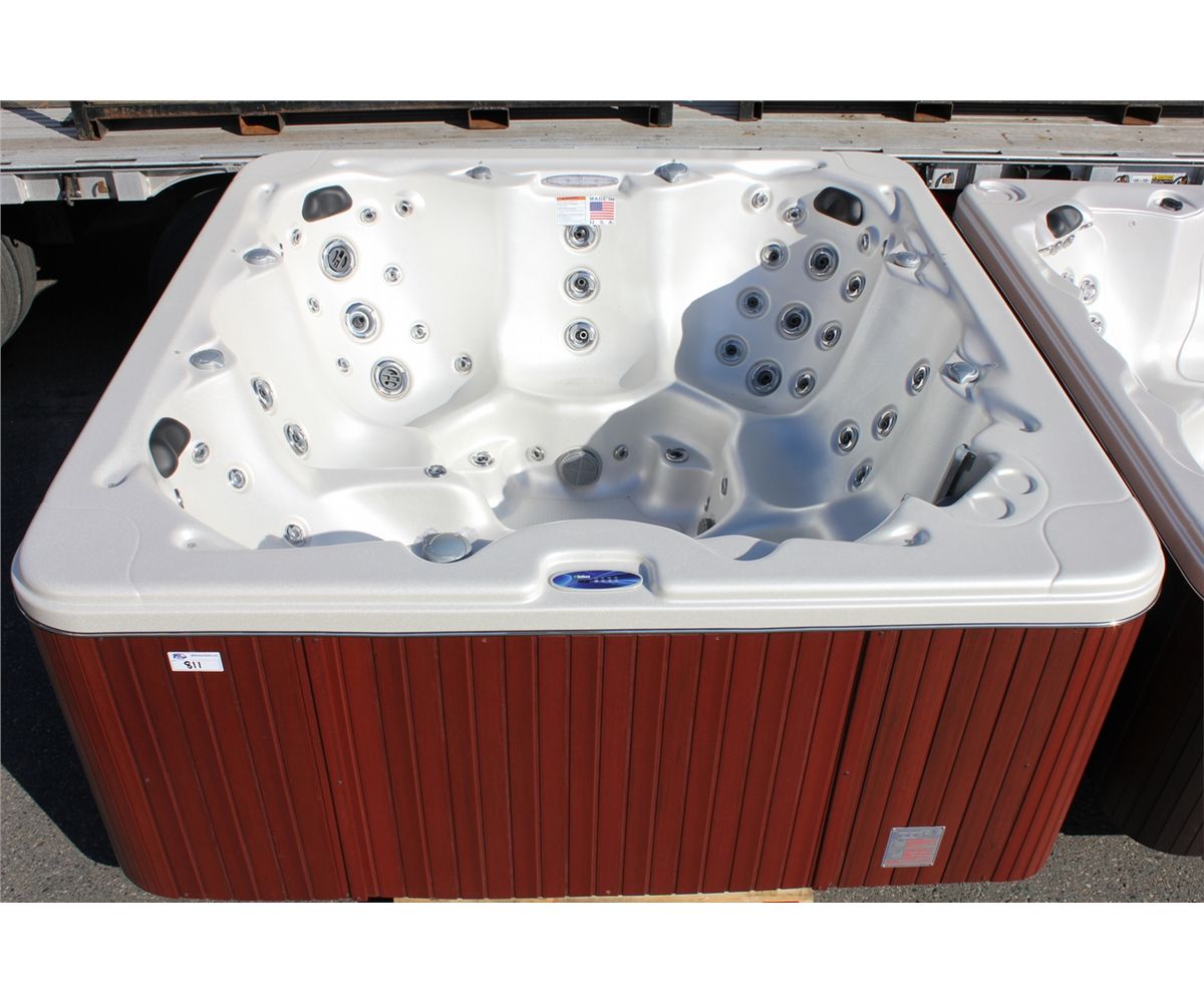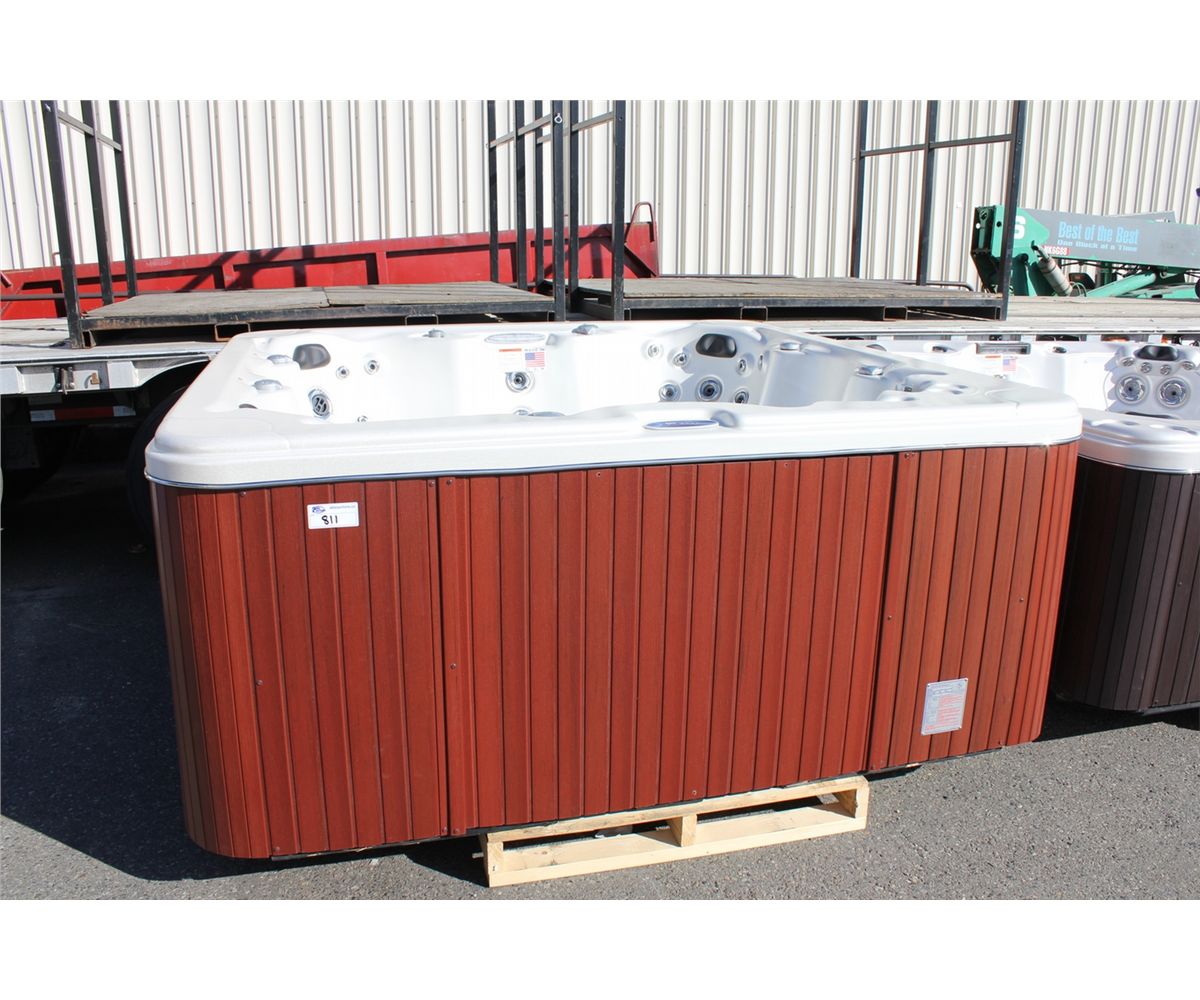 CAL SPAS VICTORY EXTREME SERIES HOT TUB WITH OYSTER INTERIOR AND 8' MAHOGANY CABINET. C/W: 60 JETS, 2 X 6.0 HP PUMPS, 50 SQ FT FILTER, 3 PILLOWS, 5.5 KW FLOWTHRU HEATER, OZONATOR, LOUNGER AND MORE...... S/N 005811