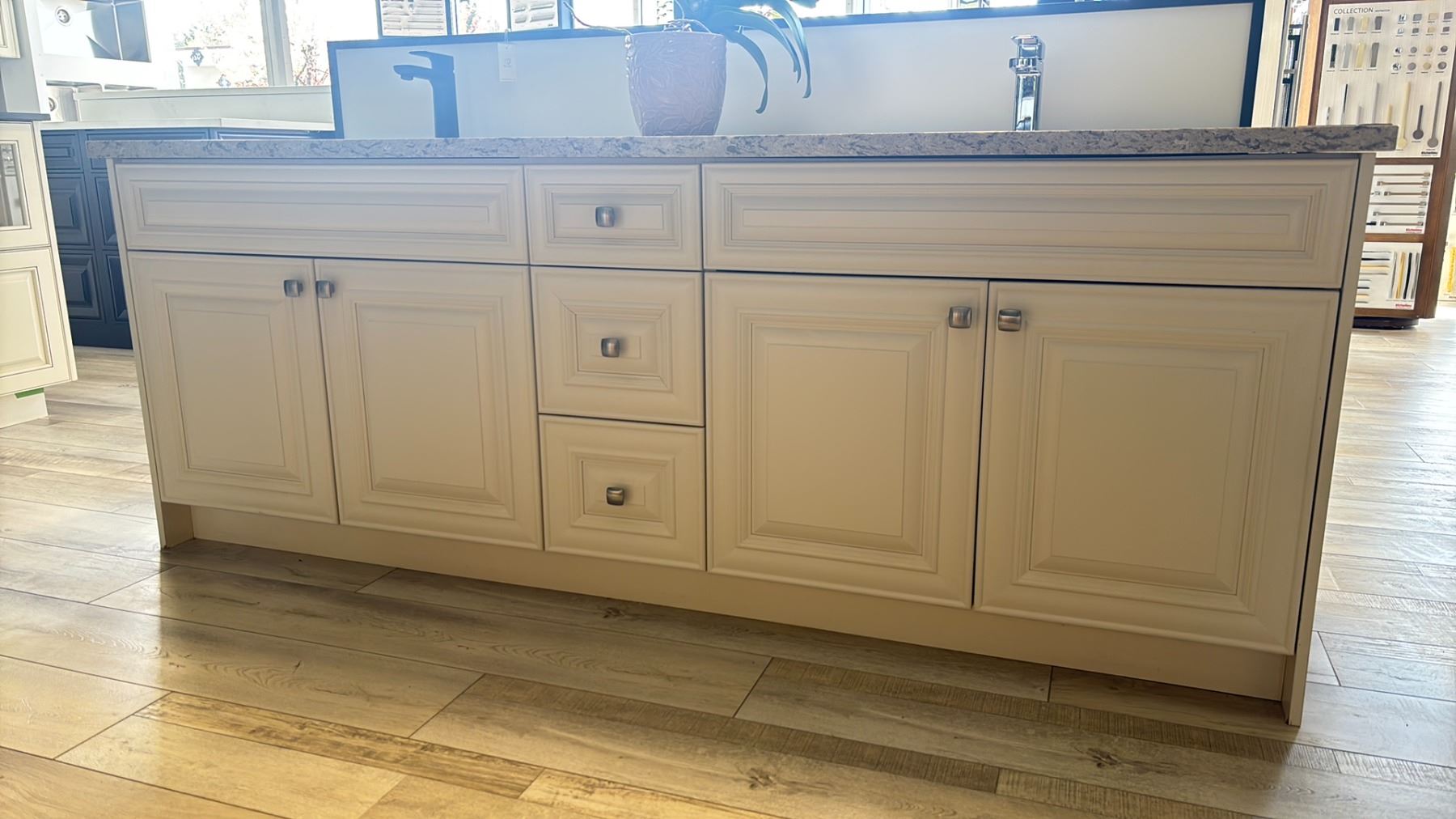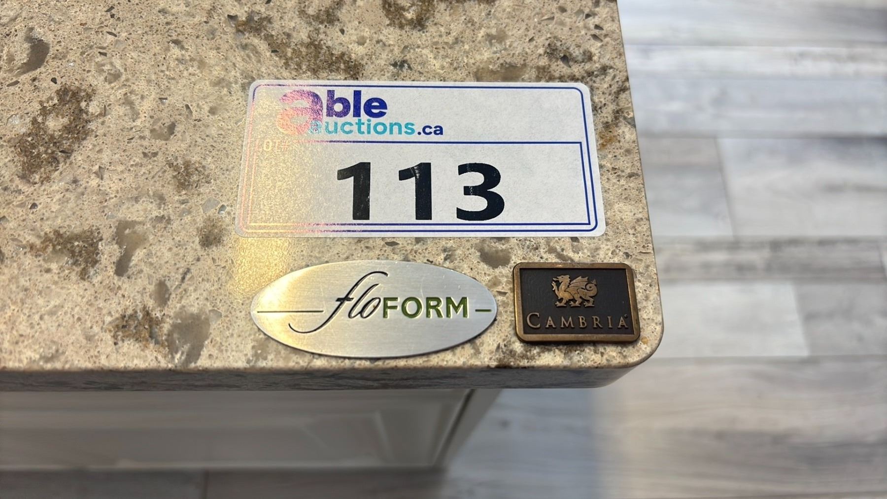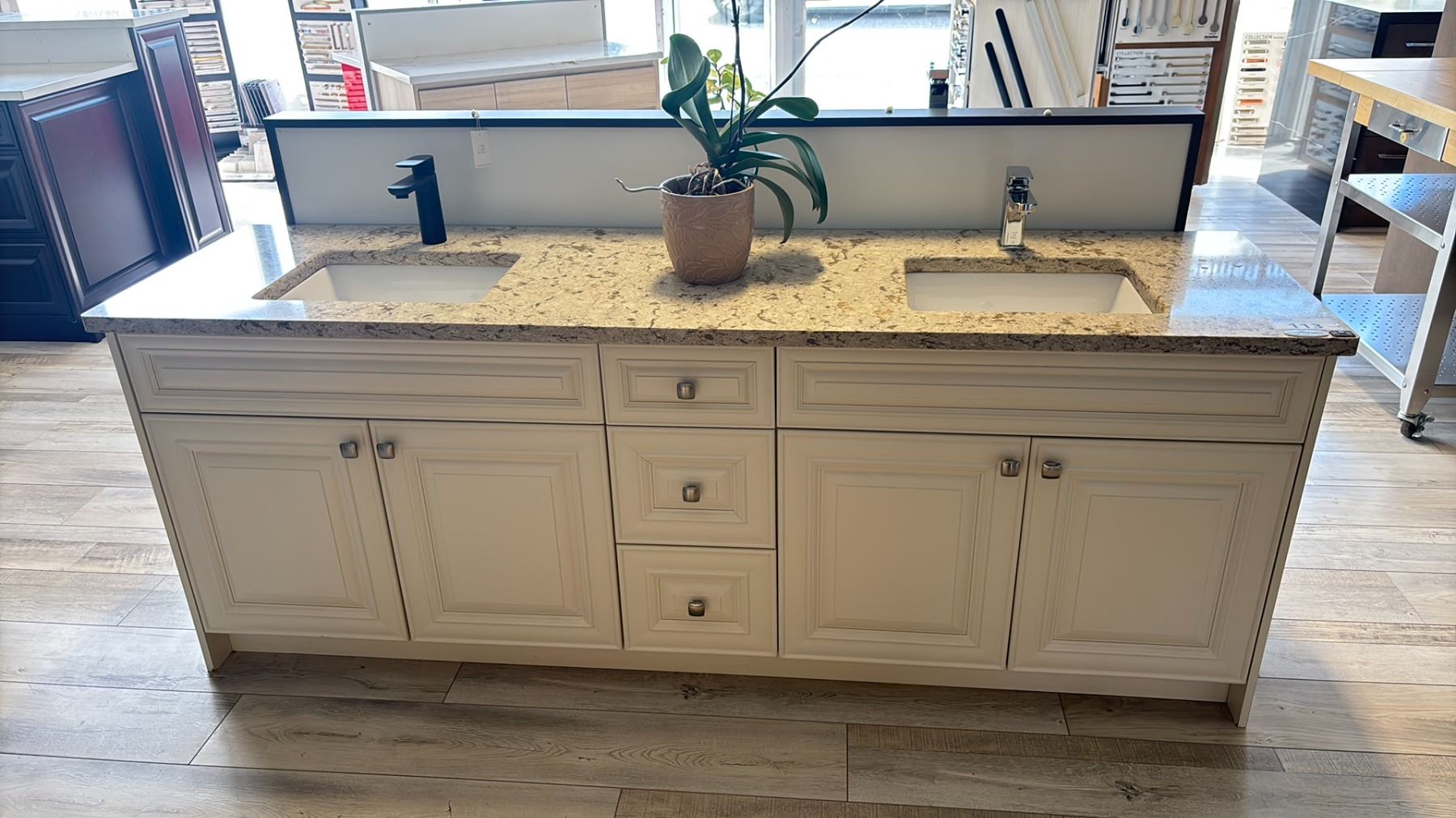 CAMBRIA FLOFORM BATHROOM VANITY DOUBLE SINK CABINET W/2 MIS MATCHED FAUCETS OFF WHITE WITH BEIGE STONE COUNTER TOP *APPROX. DIMENSIONS - 7FT ACROSS X 1 3/4FT WIDE X 2 1/2FT HIGH*