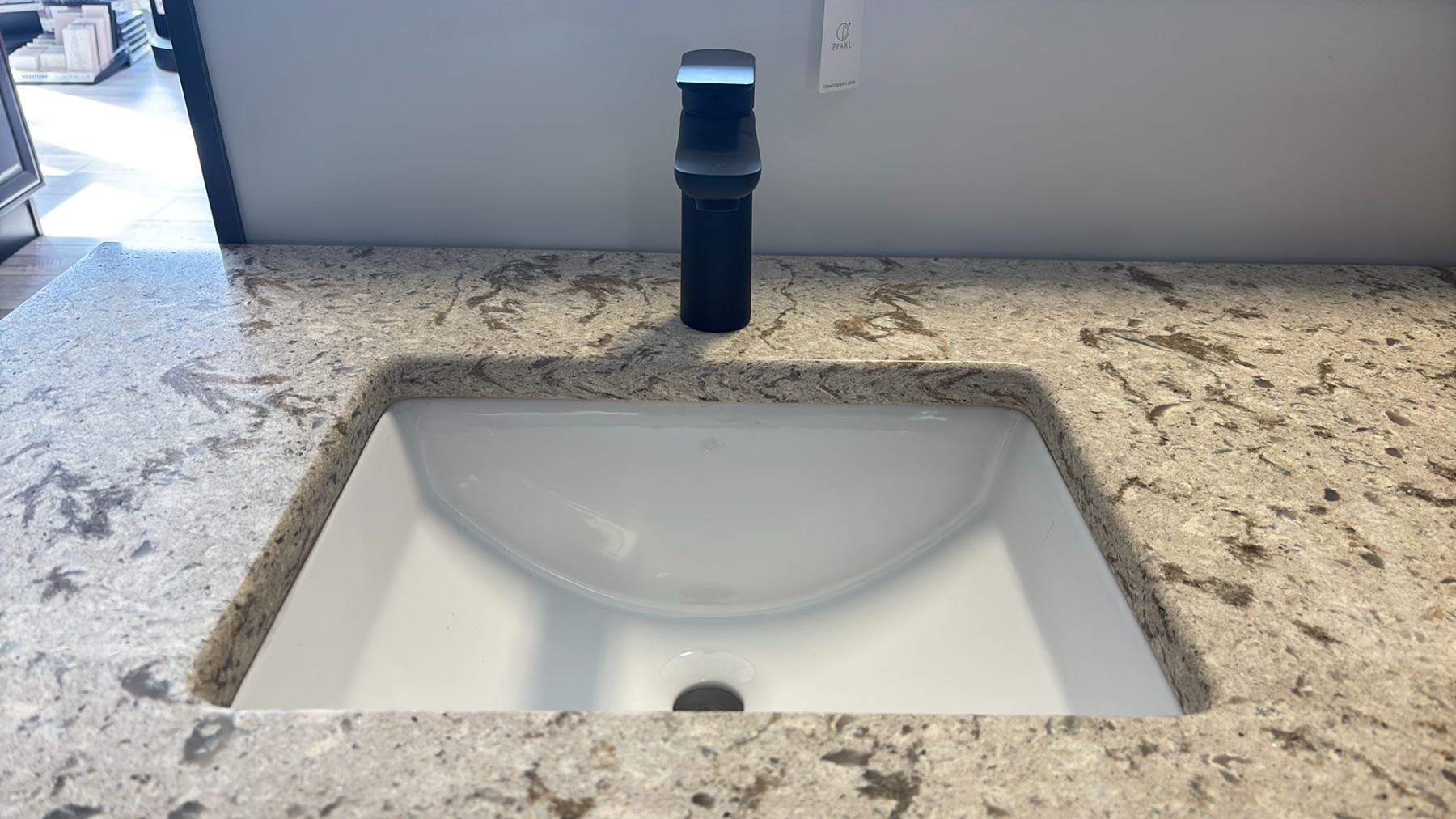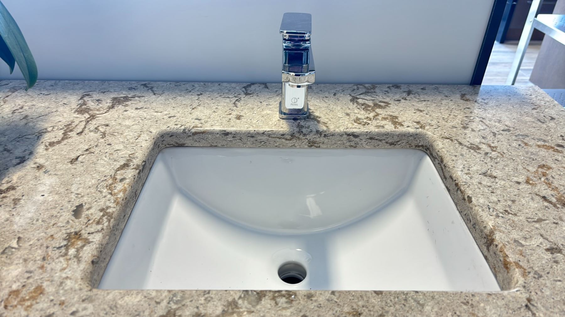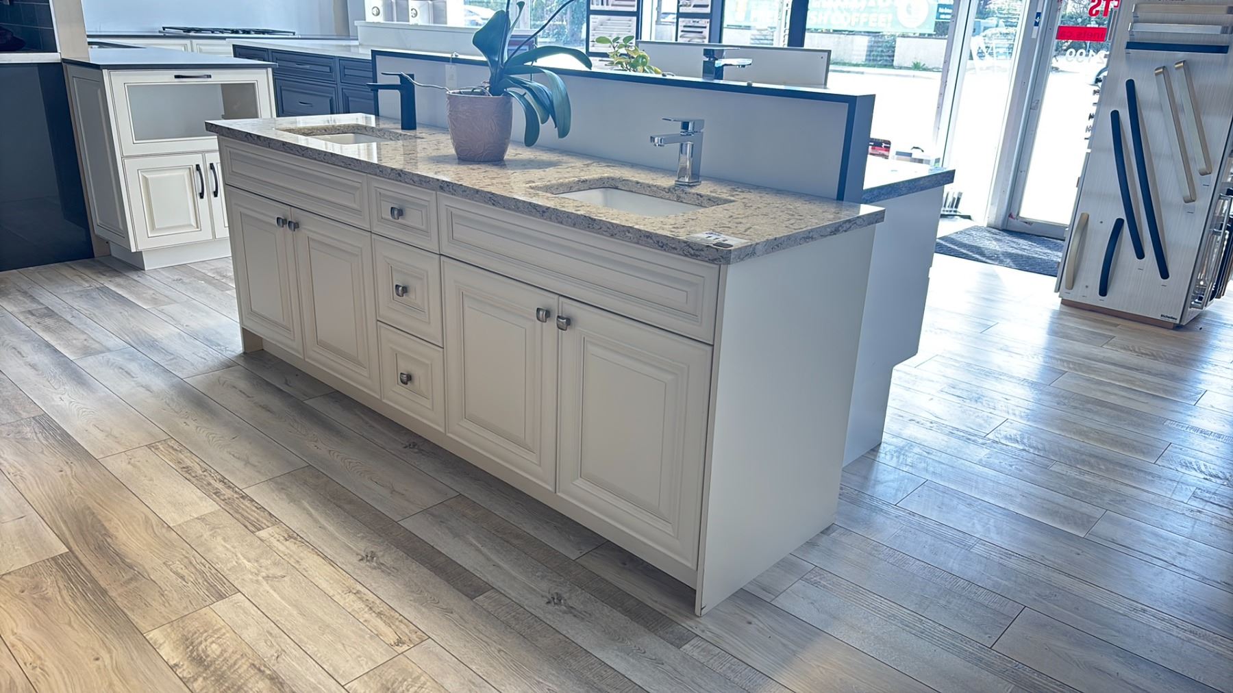CAMBRIA FLOFORM BATHROOM VANITY DOUBLE SINK CABINET W/2 MIS MATCHED FAUCETS OFF WHITE WITH BEIGE STONE COUNTER TOP *APPROX. DIMENSIONS - 7FT ACROSS X 1 3/4FT WIDE X 2 1/2FT HIGH*