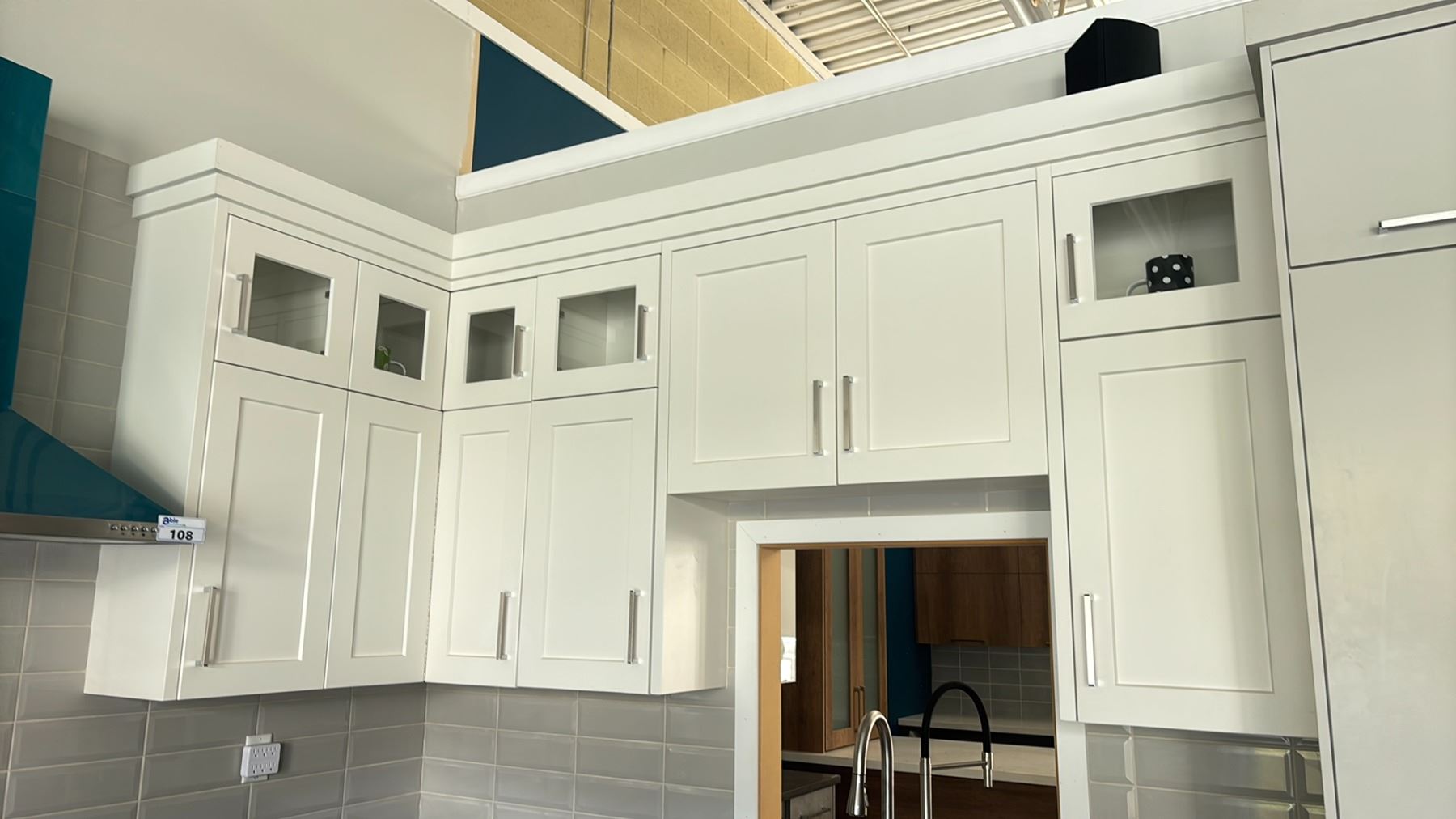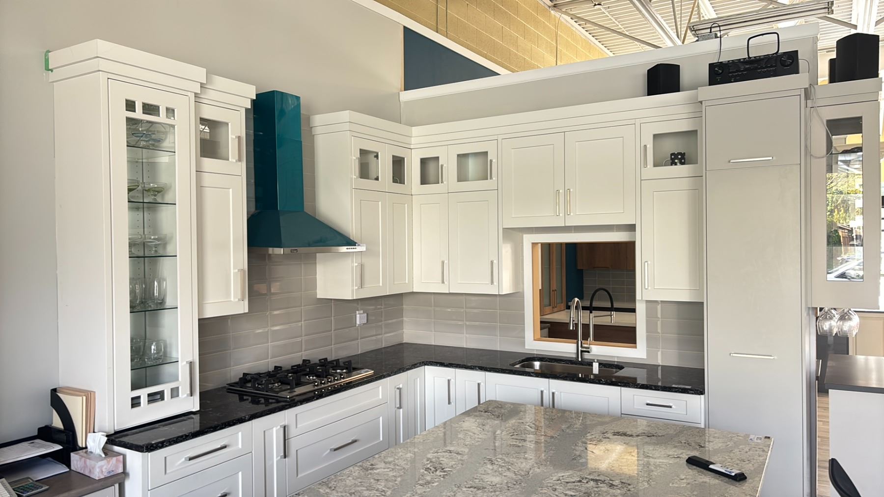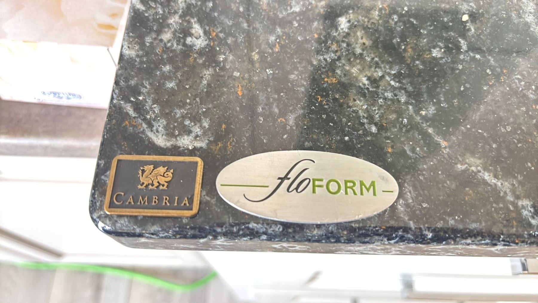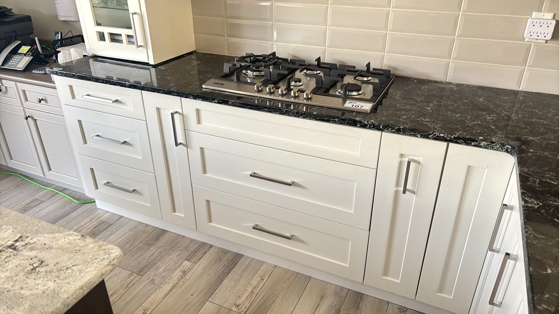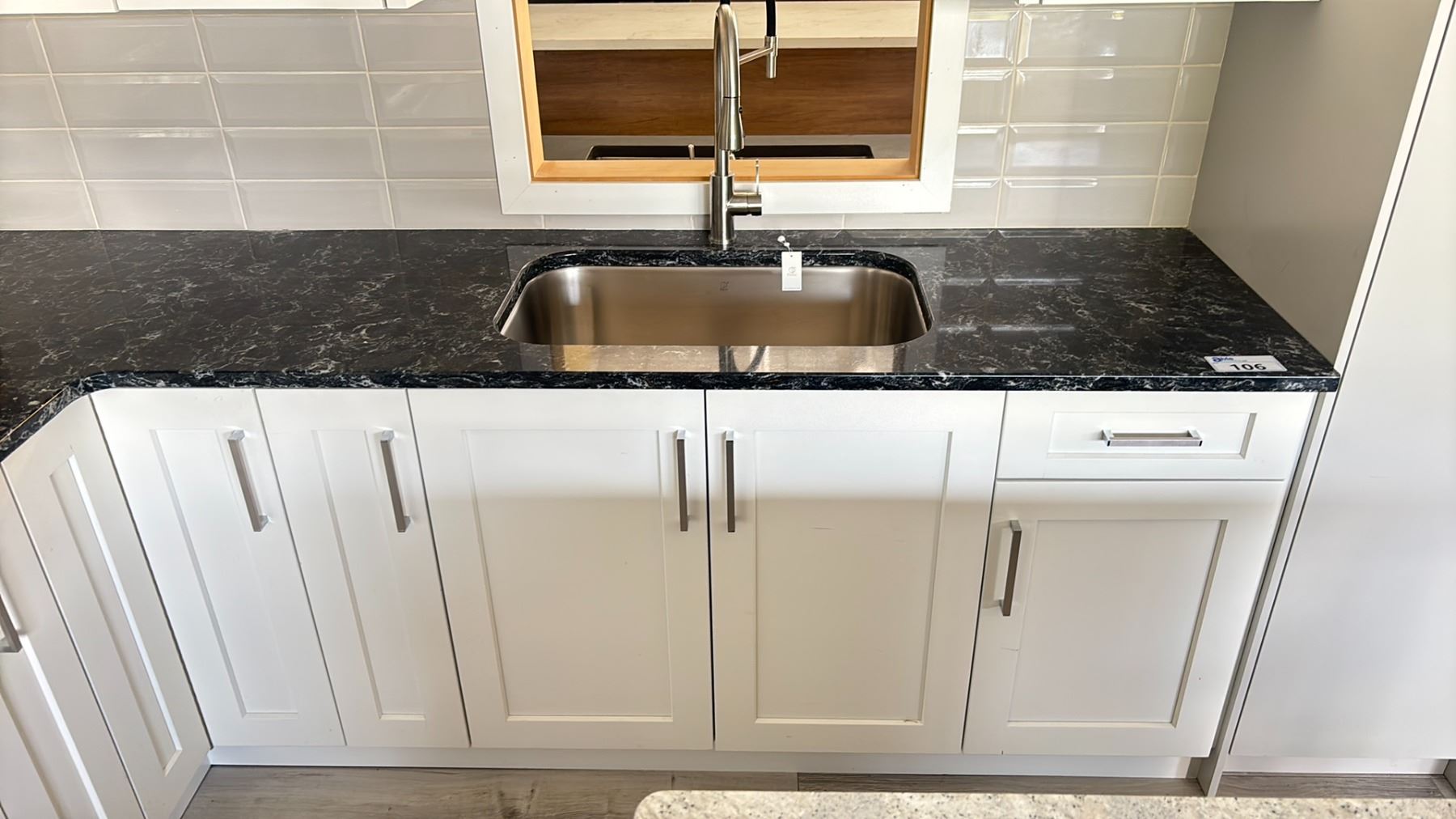 CAMBRIA FLOFORM KITCHEN CABINET SET - WHITE W/CHROME HANDLES AND BLACK STONE COUNTERTOP COMES WITH STAINLESS SINK AND FAUCET SET **GAS STOVE NOT INCLUDED** *APPROX. DIMENSIONS - BOTTOM CABINETS 9FT X 8FT X 3FT/UPPER 3.5FT X 8.5FT X 4FT* AND 2.5FT X 5.5FT* CABINETS WILL NEED TO BE REMOVED FROM THE WALL BY THE SUCCESSFUL BIDDER - PLEASE BRING TOOLS, MANPOWER