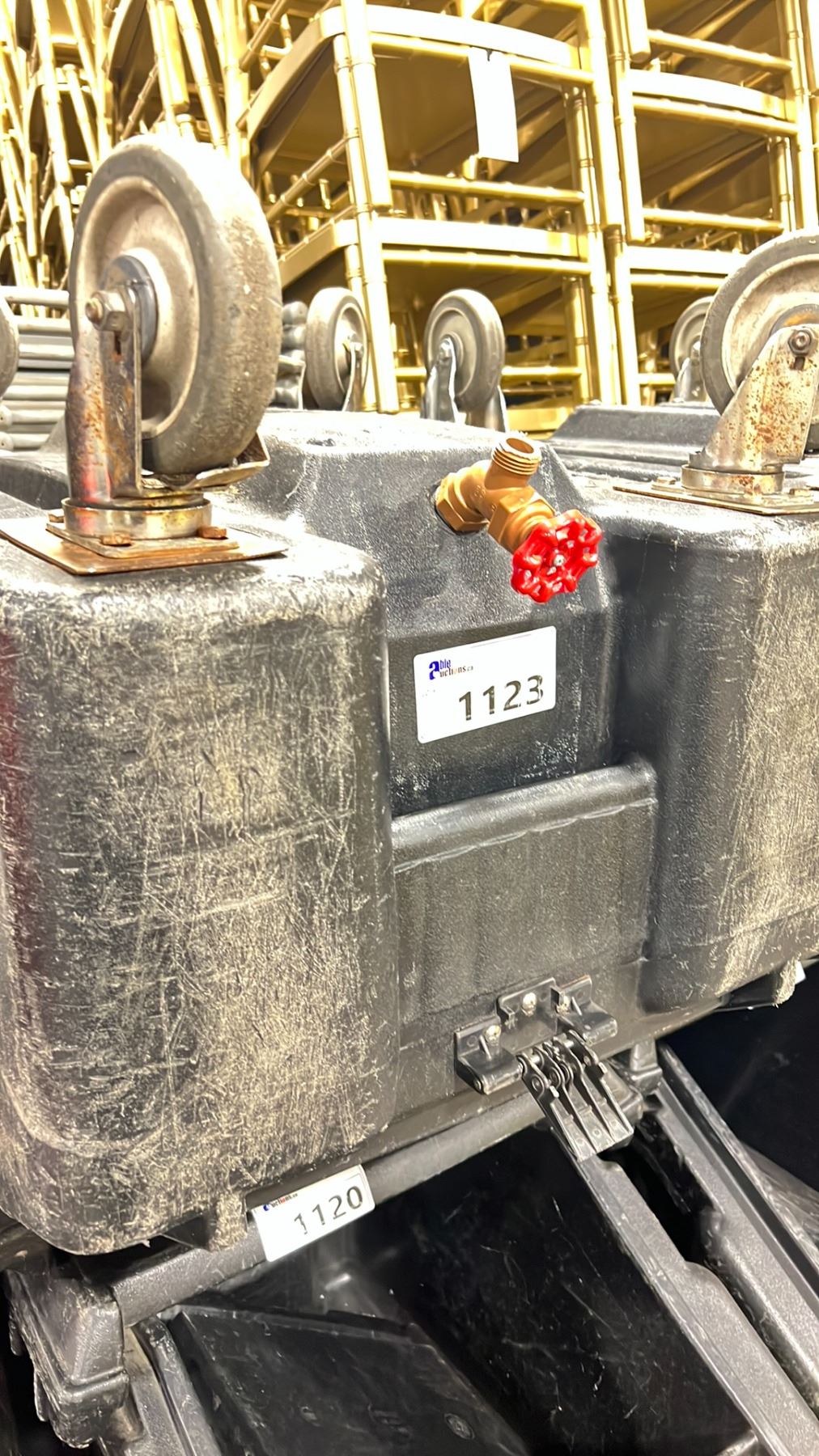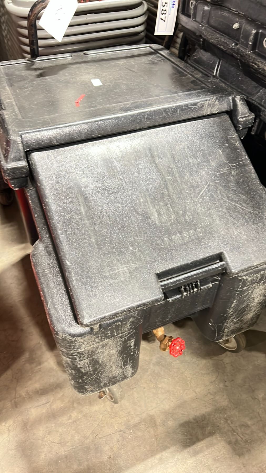 CAMBRO BLACK INSULATED MOBILE TILTED FRONT ICE TRANSPORT CONTAINER - 22"W X 28"D X 30"H *MISSING FRONT LID FLAP*