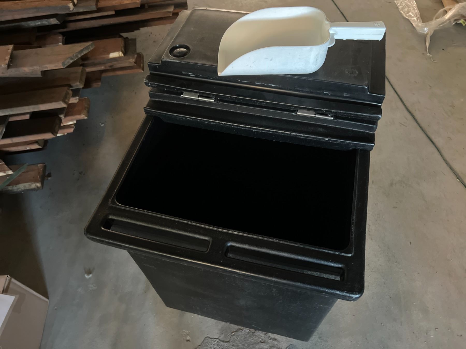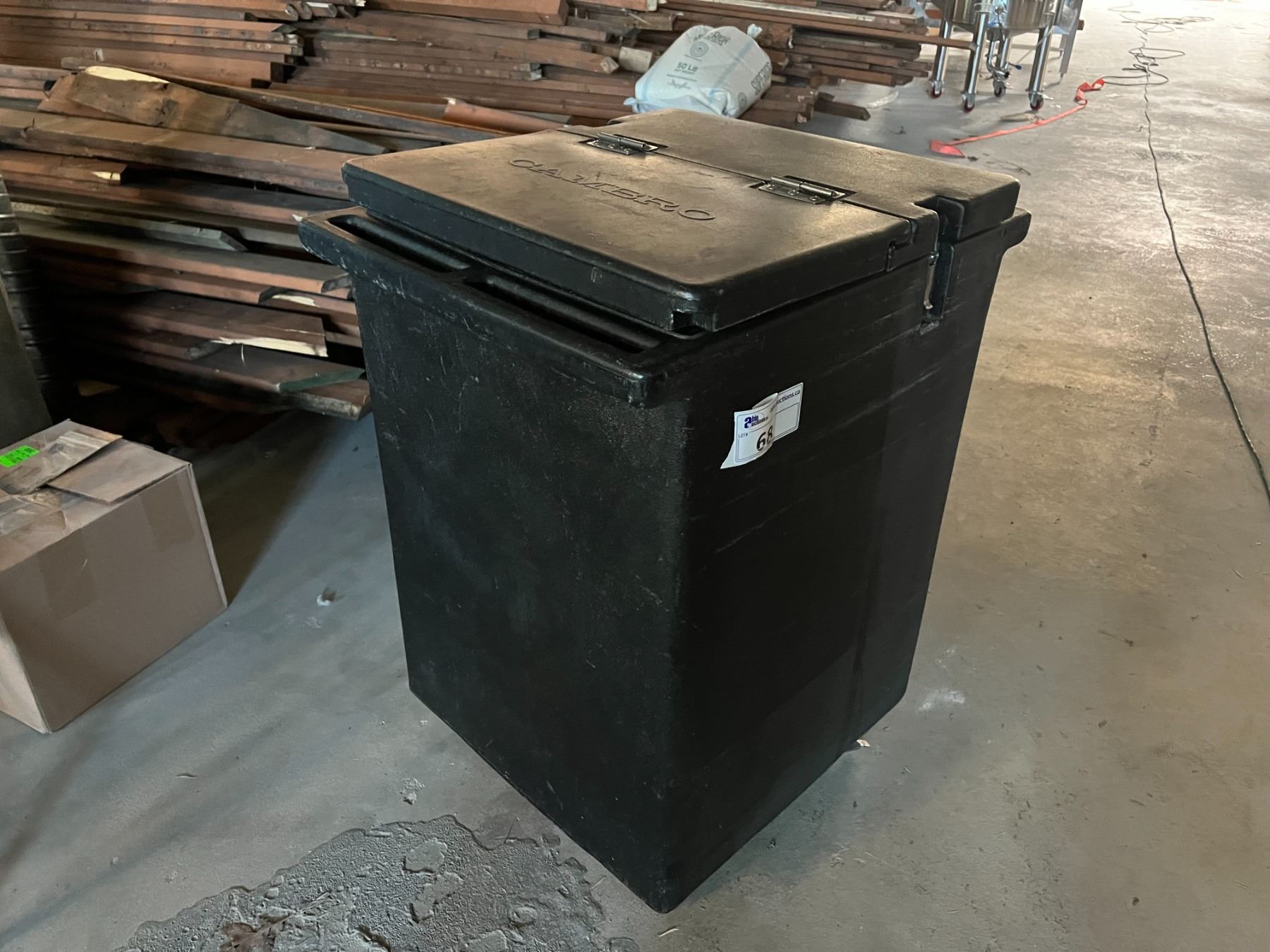 CAMBRO INSULATED PORTABLE ICE STORAGE ON WHEELS. 22X27" WITH SCOOP. HAS A DRAIN TAP. LID CAN BE REMOVED FOR EASY CLEANING