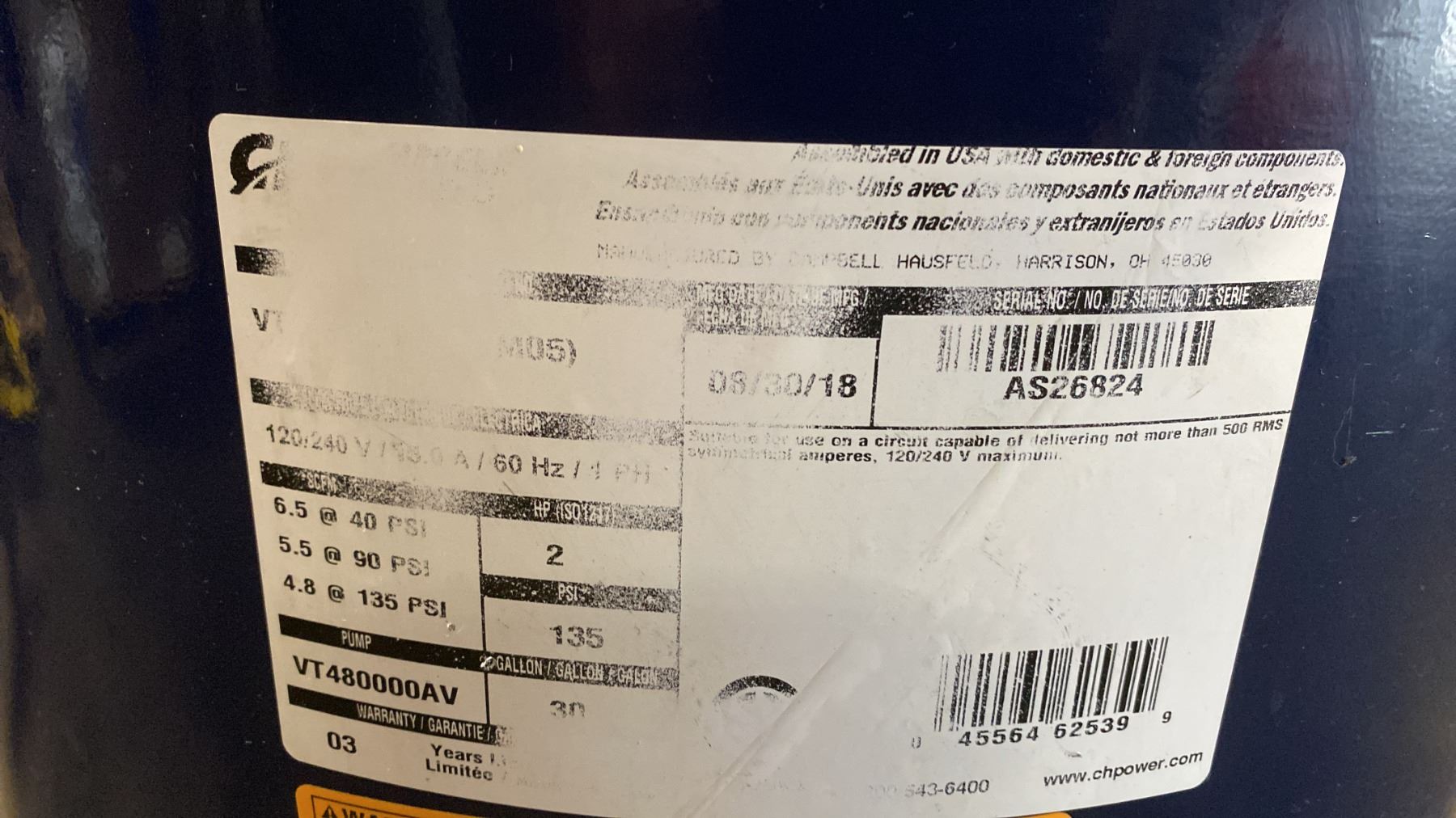 CAMPBELL HAUSFELD 2HP, 30 GALLON BLUE VERTICAL AIR COMPRESSOR