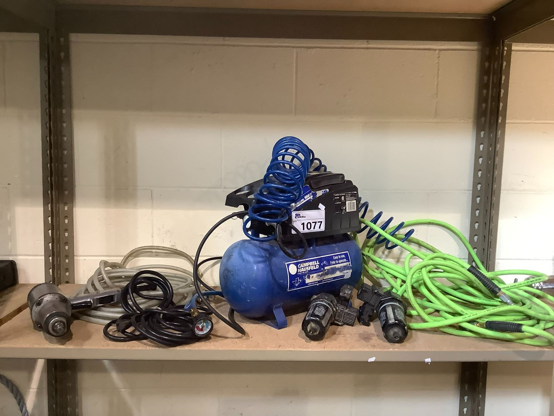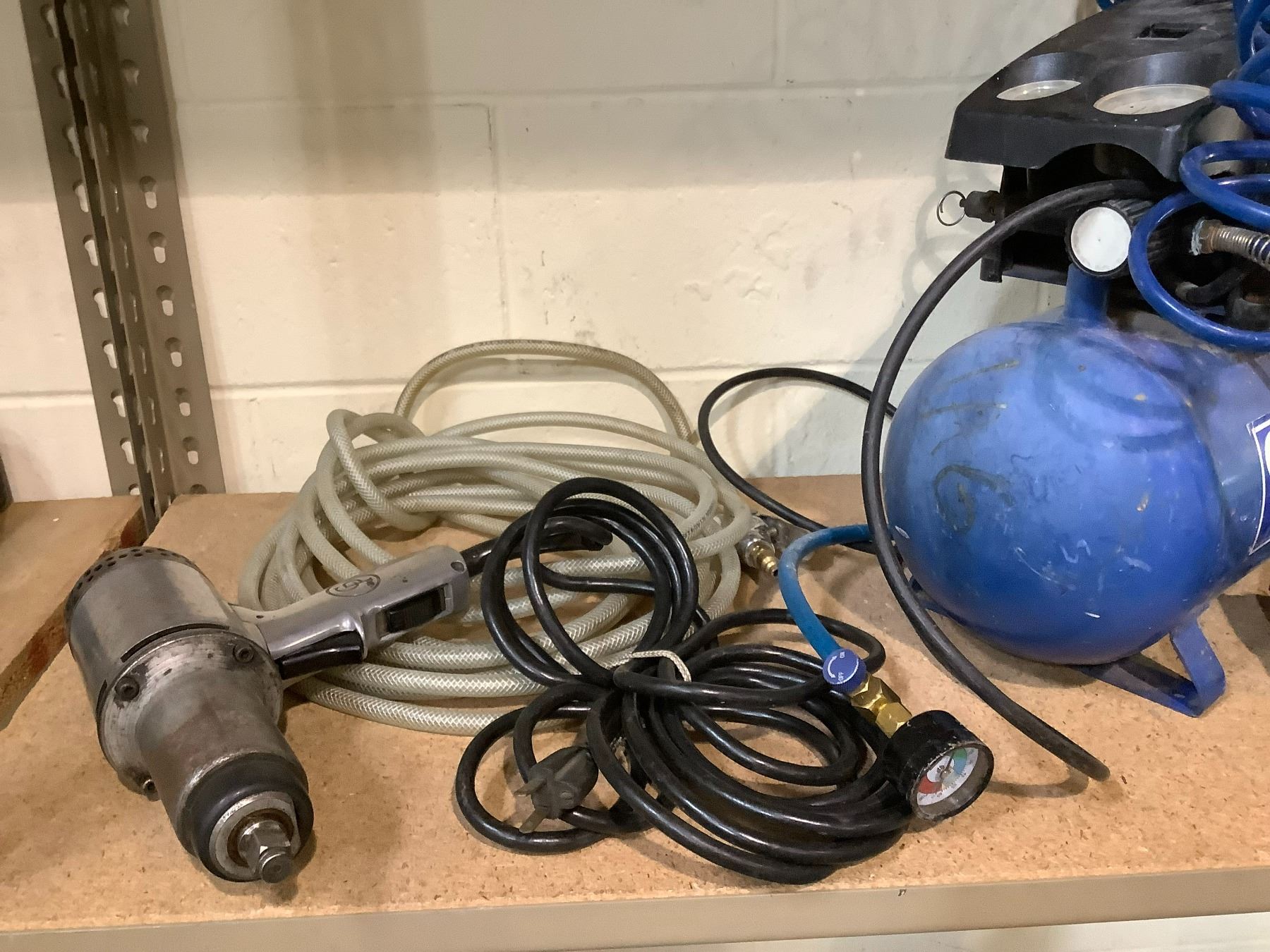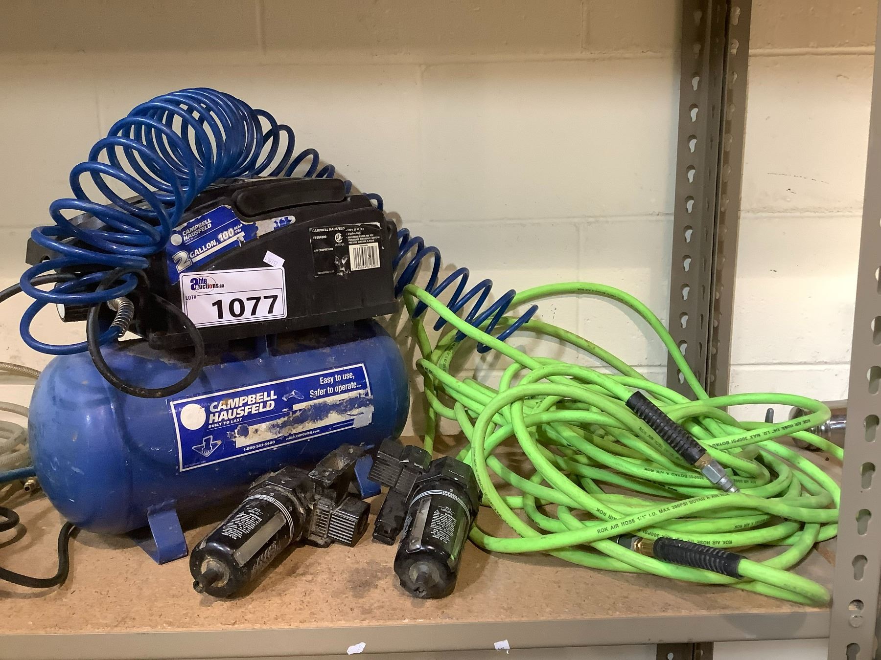 CAMPBELL HAUSFELD AIR COMPRESSOR 2 GAL 100 MAX PSI WITH AIR HOSE, AIR DRILL, & MORE