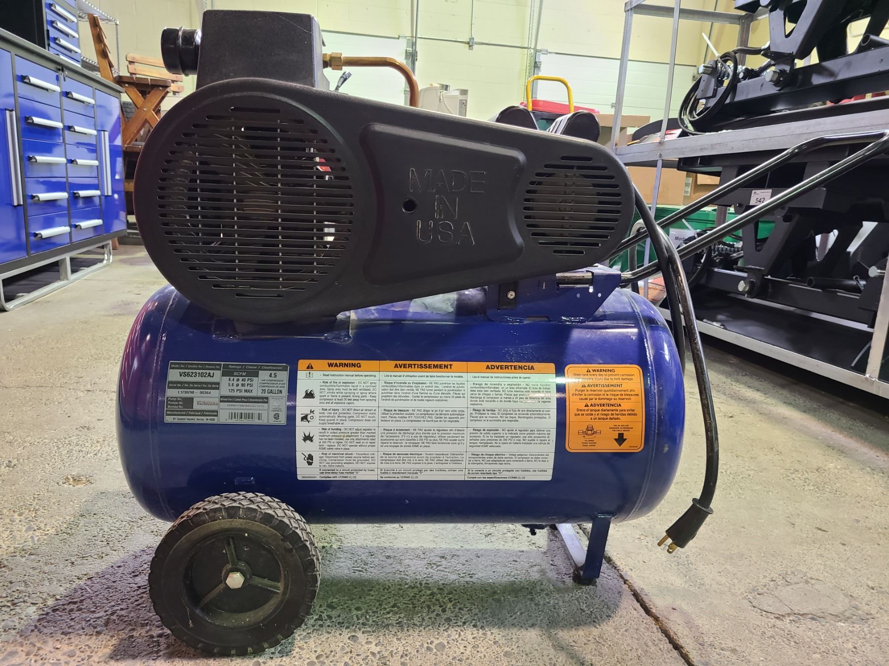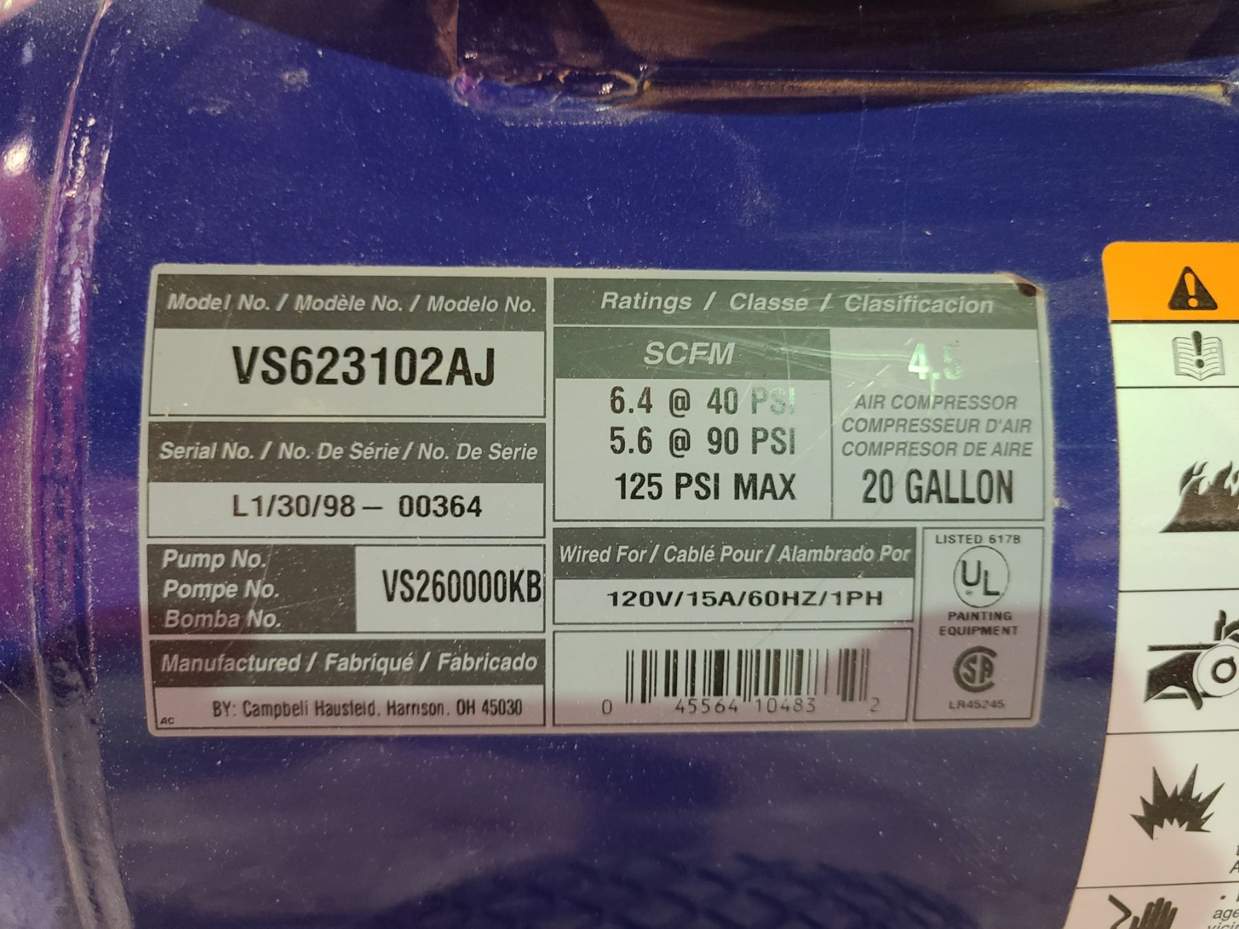 CAMPBELL HAUSFELD SERIOUS DUTY AIR COMPRESSON 20 GALLON 4.5HP MODEL VS623102AJ